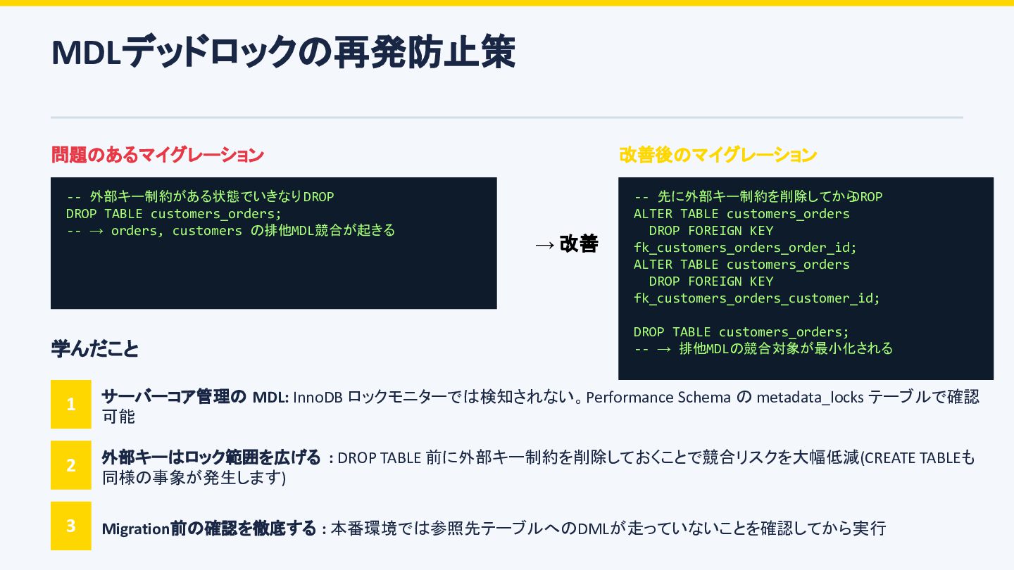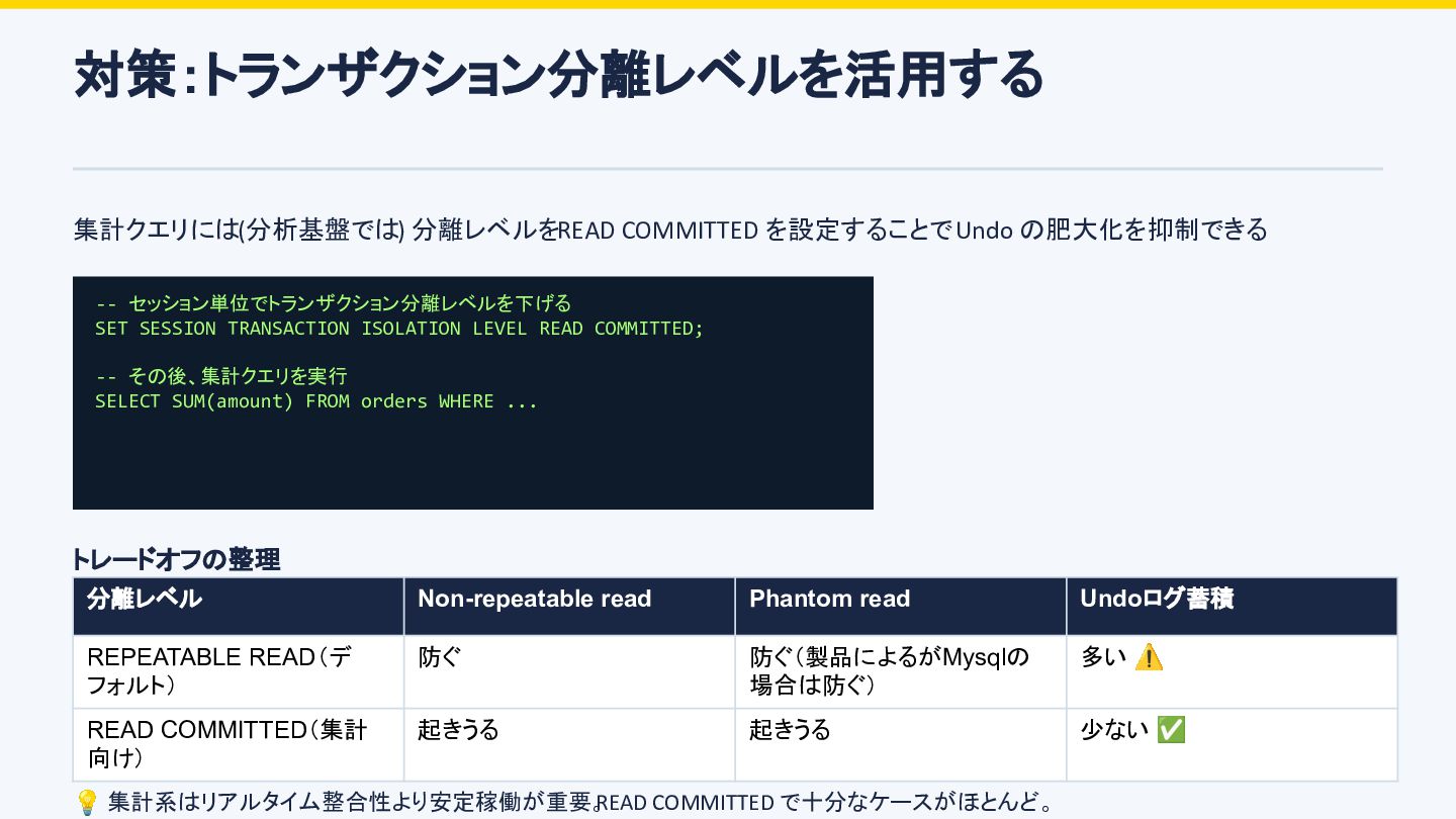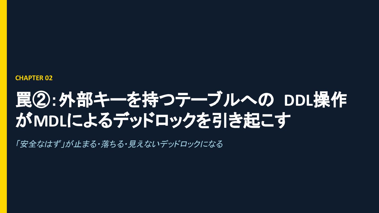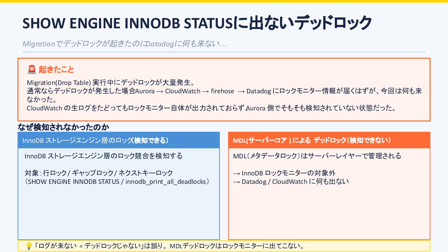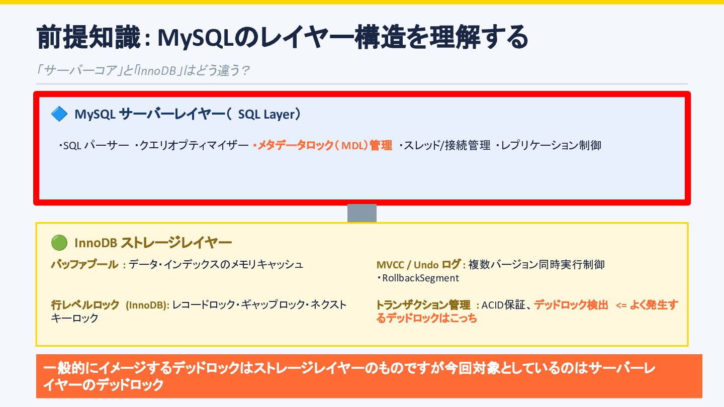 [email protected]','Bob') ← クエリB *** (2) HOLDS THE LOCK(S): index idx_email of table 'app'.'users' trx id 422 lock_mode X locks gap before rec ← B も同じギャップロックを保持 *** (2) WAITING FOR THIS LOCK TO BE GRANTED: index idx_email of table 'app'.'users' trx id 422 lock_mode X locks gap before rec insert intention waiting ← A のギャップロックに阻まれている *** WE ROLL BACK TRANSACTION (2) ← ⑤ TX(2)=クエリBがロールバック対象 読み方まとめ : ① どのクエリか → ② 何を持っているか → ③ 何を待っているか → ④ 相手も同じ構造か(=相互待機) → ⑤ どちらが ロールバックされたか
