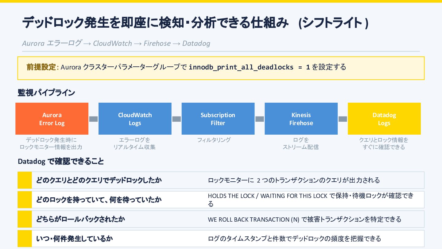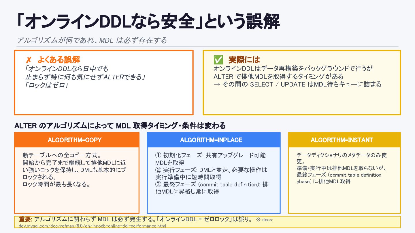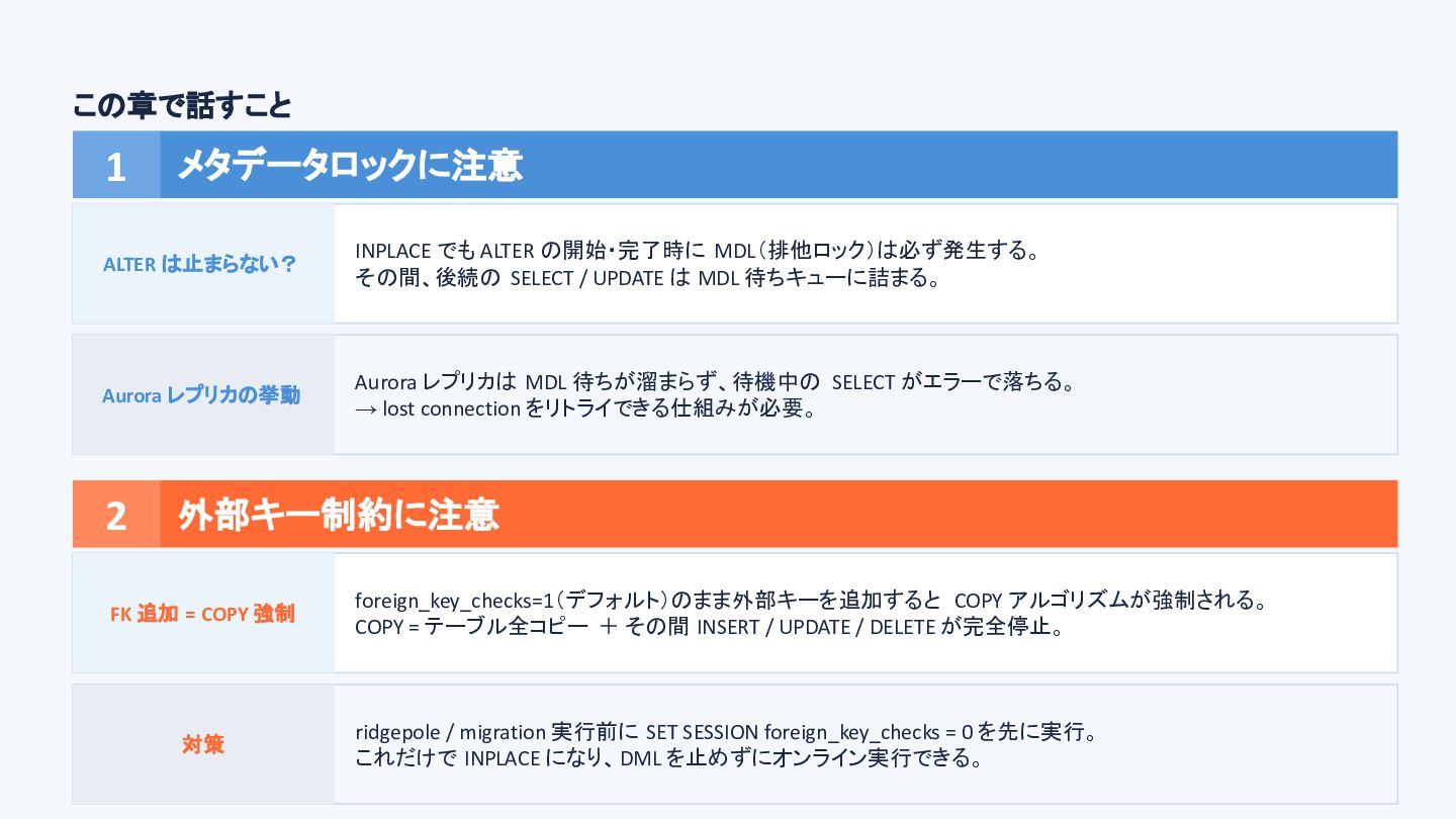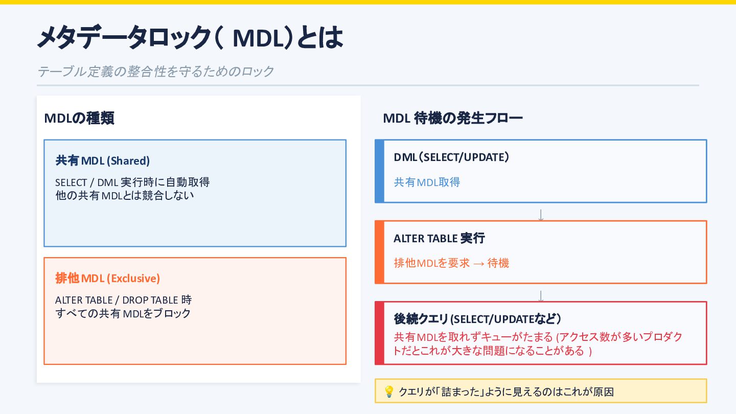 [email protected]','Bob') ← クエリB *** (2) HOLDS THE LOCK(S): index idx_email of table 'app'.'users' trx id 422 lock_mode X locks gap before rec ← B も同じギャップロックを保持 *** (2) WAITING FOR THIS LOCK TO BE GRANTED: index idx_email of table 'app'.'users' trx id 422 lock_mode X locks gap before rec insert intention waiting ← A のギャップロックに阻まれている *** WE ROLL BACK TRANSACTION (2) ← ⑤ TX(2)=クエリBがロールバック対象 読み方まとめ : ① どのクエリか → ② 何を持っているか → ③ 何を待っているか → ④ 相手も同じ構造か(=相互待機) → ⑤ どちらが ロールバックされたか