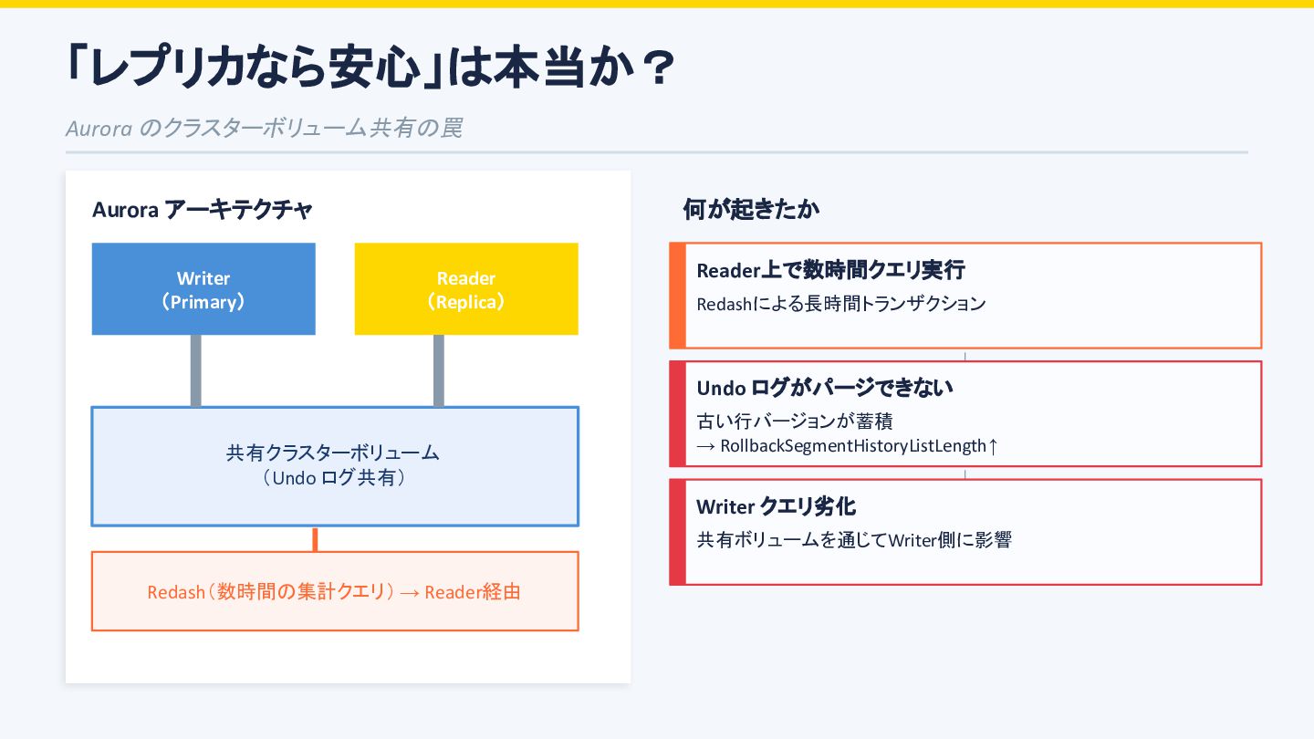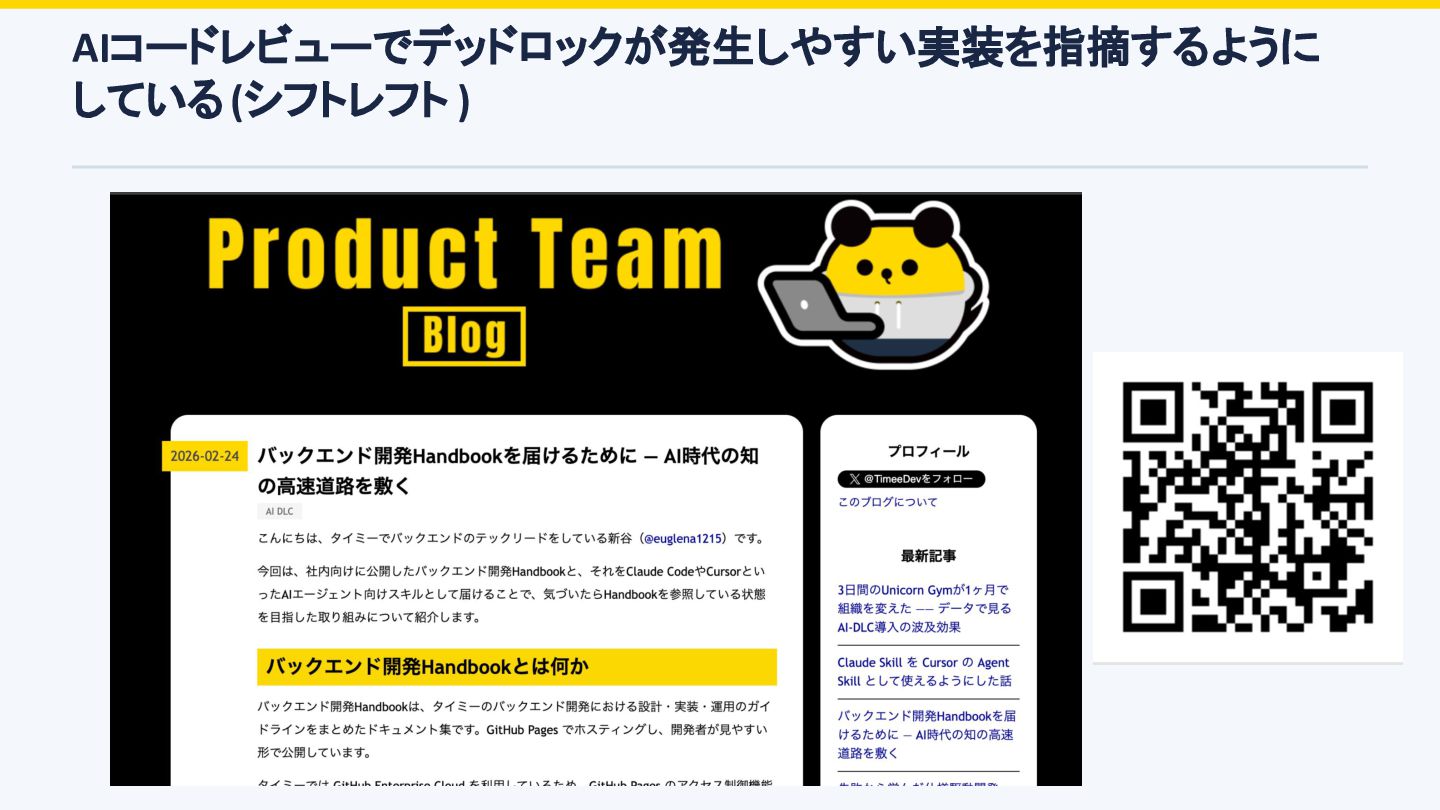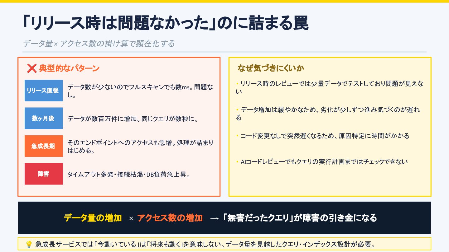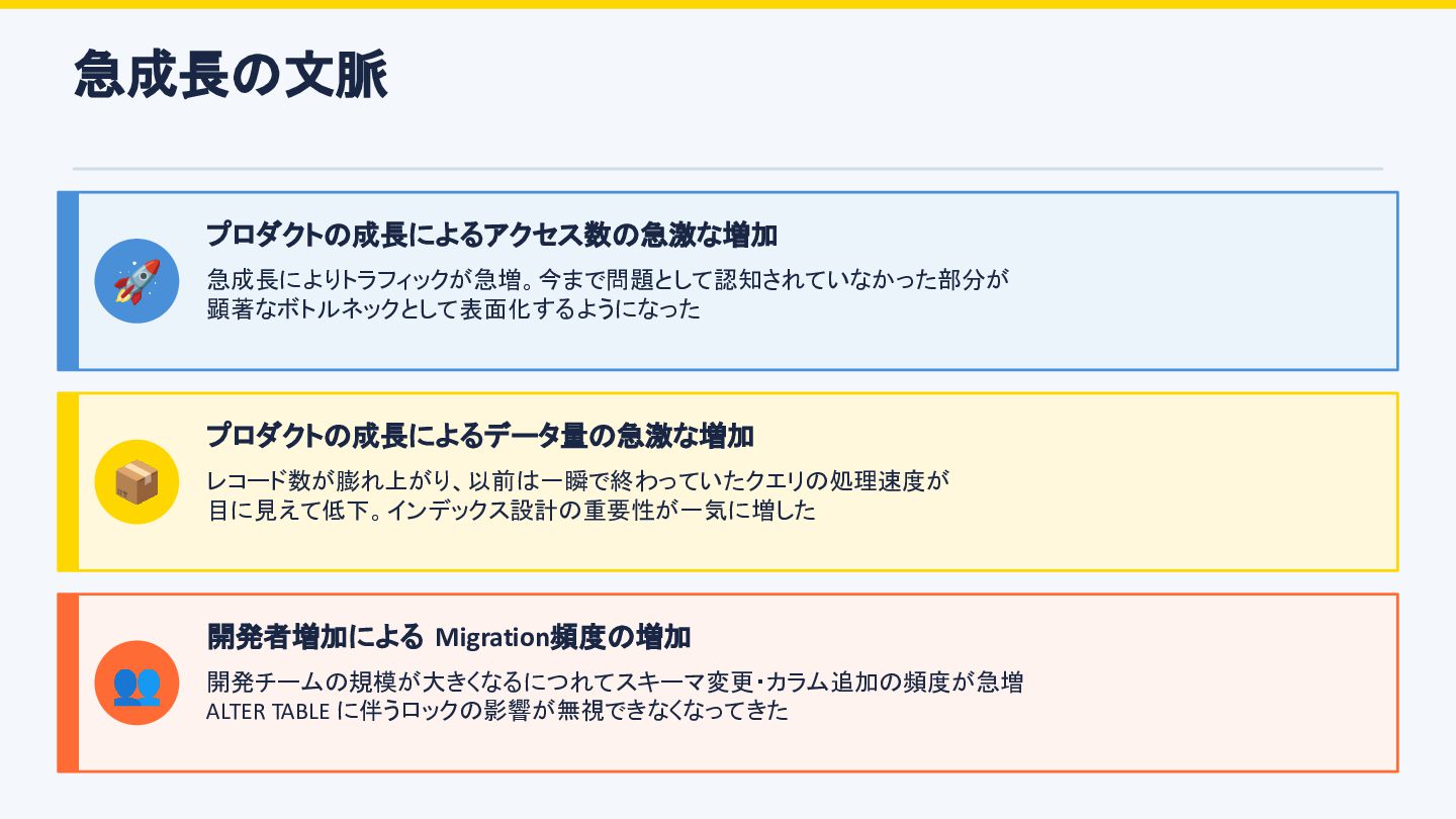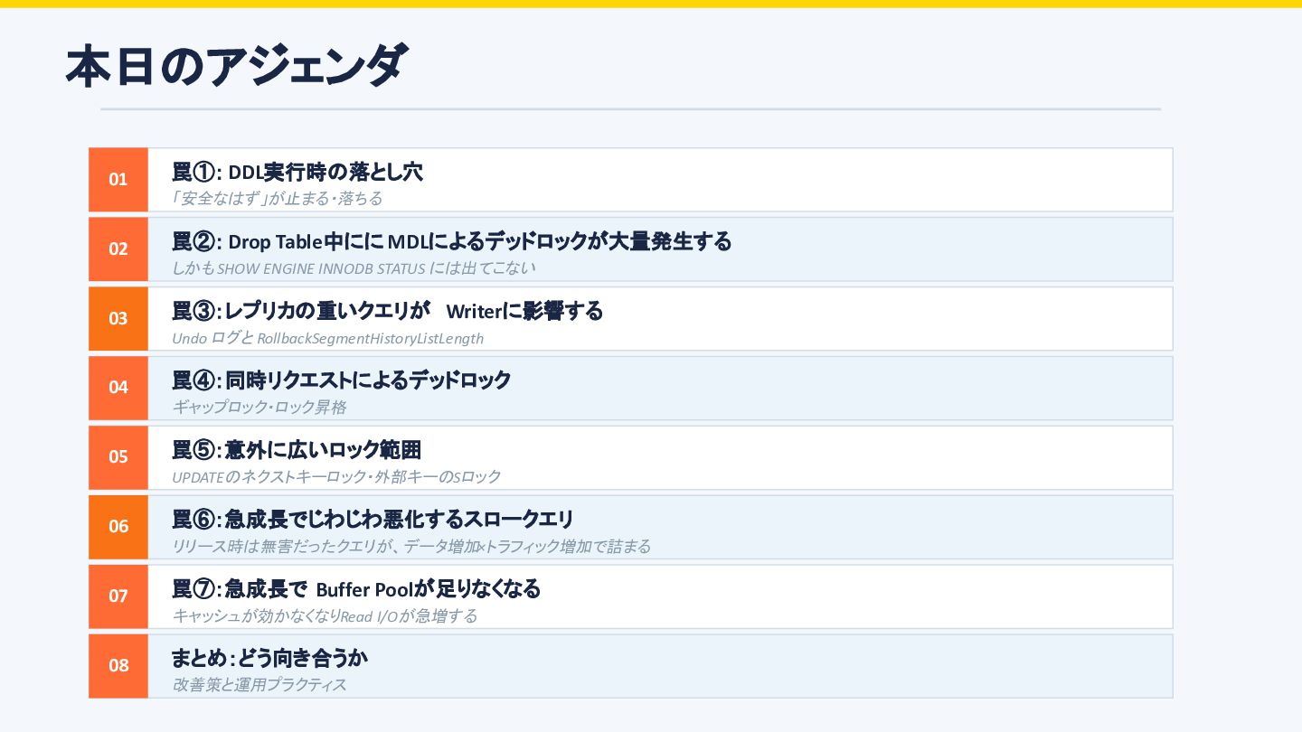 [email protected]','Bob') ← クエリB *** (2) HOLDS THE LOCK(S): index idx_email of table 'app'.'users' trx id 422 lock_mode X locks gap before rec ← B も同じギャップロックを保持 *** (2) WAITING FOR THIS LOCK TO BE GRANTED: index idx_email of table 'app'.'users' trx id 422 lock_mode X locks gap before rec insert intention waiting ← A のギャップロックに阻まれている *** WE ROLL BACK TRANSACTION (2) ← ⑤ TX(2)=クエリBがロールバック対象 読み方まとめ : ① どのクエリか → ② 何を持っているか → ③ 何を待っているか → ④ 相手も同じ構造か(=相互待機) → ⑤ どちらが ロールバックされたか