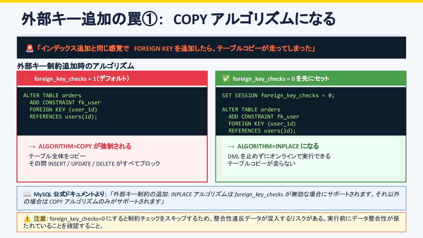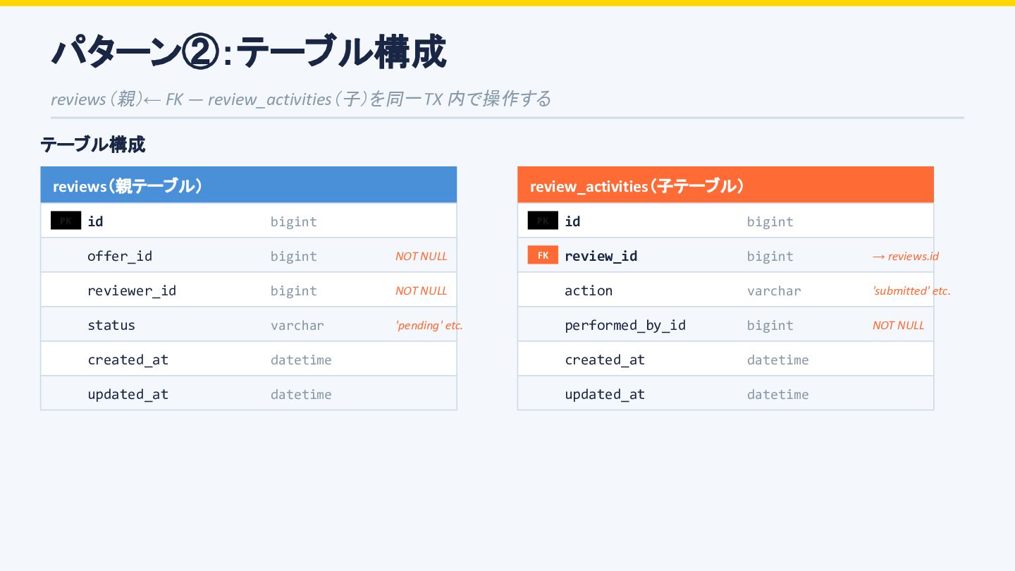 [email protected]','Alice') ← クエリA *** (1) HOLDS THE LOCK(S): ← ② 保持しているロック index idx_email of table 'app'.'users' trx id 421 lock_mode X locks gap before rec ← ギャップロック(X) を保持中 *** (1) WAITING FOR THIS LOCK TO BE GRANTED: ← ③ 待っているロック index idx_email of table 'app'.'users' trx id 421 lock_mode X locks gap before rec insert intention waiting ← INSERT をブロックされている *** (2) TRANSACTION: ← ④ もう一方のTXも同じ構造を確認 TRANSACTION 422, ACTIVE 0 sec inserting MySQL thread id 11, query id 501 app INSERT INTO users (email,name) VALUES ('