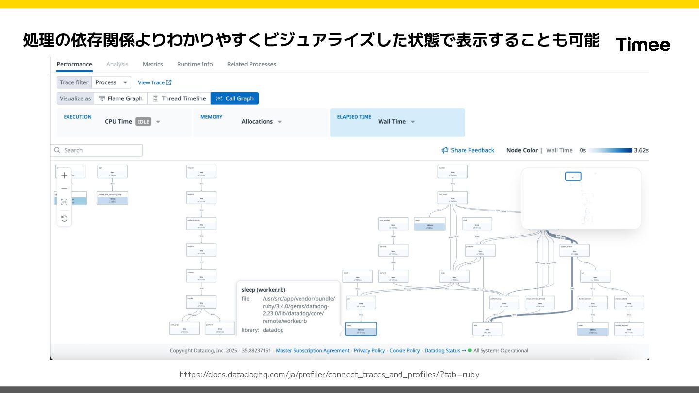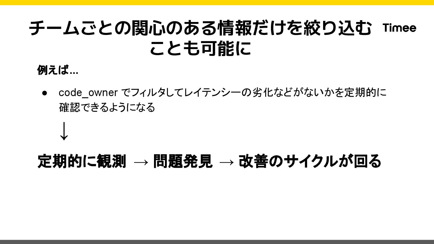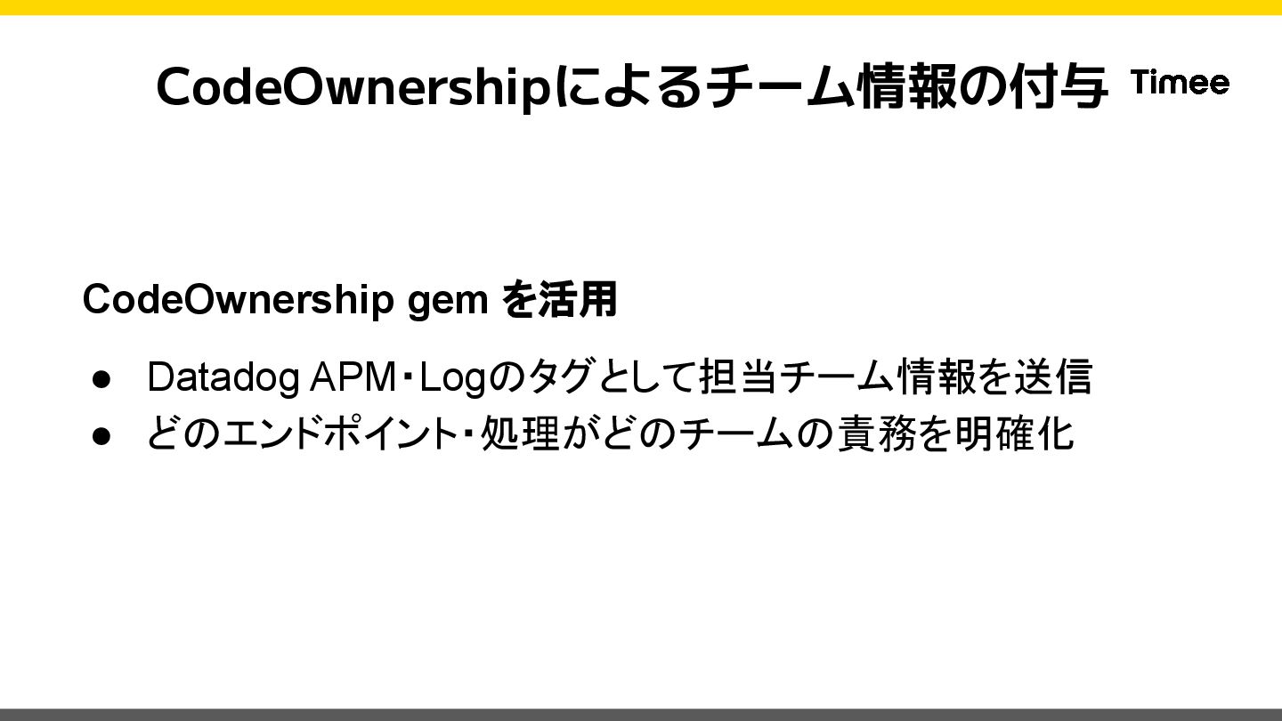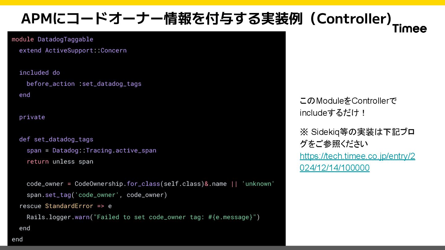 private def set_datadog_tags span = Datadog::Tracing.active_span return unless span code_owner = CodeOwnership.for_class(self.class)&.name || 'unknown' span.set_tag('code_owner', code_owner) rescue StandardError => e Rails.logger.warn("Failed to set code_owner tag: #{e.message}") end end このModuleをControllerで includeするだけ! ※ Sidekiq等の実装は下記ブロ グをご参照ください https://tech.timee.co.jp/entry/2 024/12/14/100000