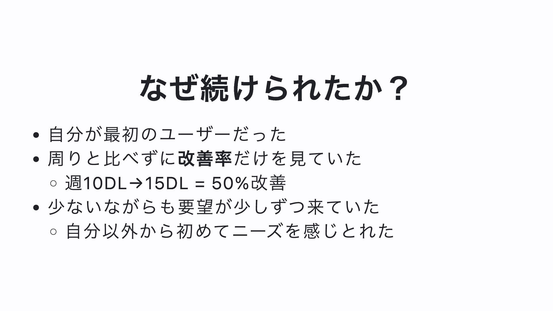 なぜ続けられたか? 自分が最初のユーザーだった 周りと比べずに改善率だけを見ていた 週10DL→15DL = 50%改善 少ないながらも要望が少しずつ来ていた 自分以外から初めてニーズを感じとれた
