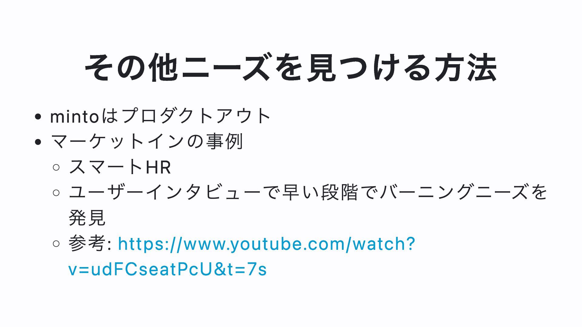 その他ニーズを見つける方法 mintoはプロダクトアウト マーケットインの事例 スマートHR ユーザーインタビューで早い段階でバーニングニーズを 発見 参考: https://www.youtube.com/watch? v=udFCseatPcU&t=7s
