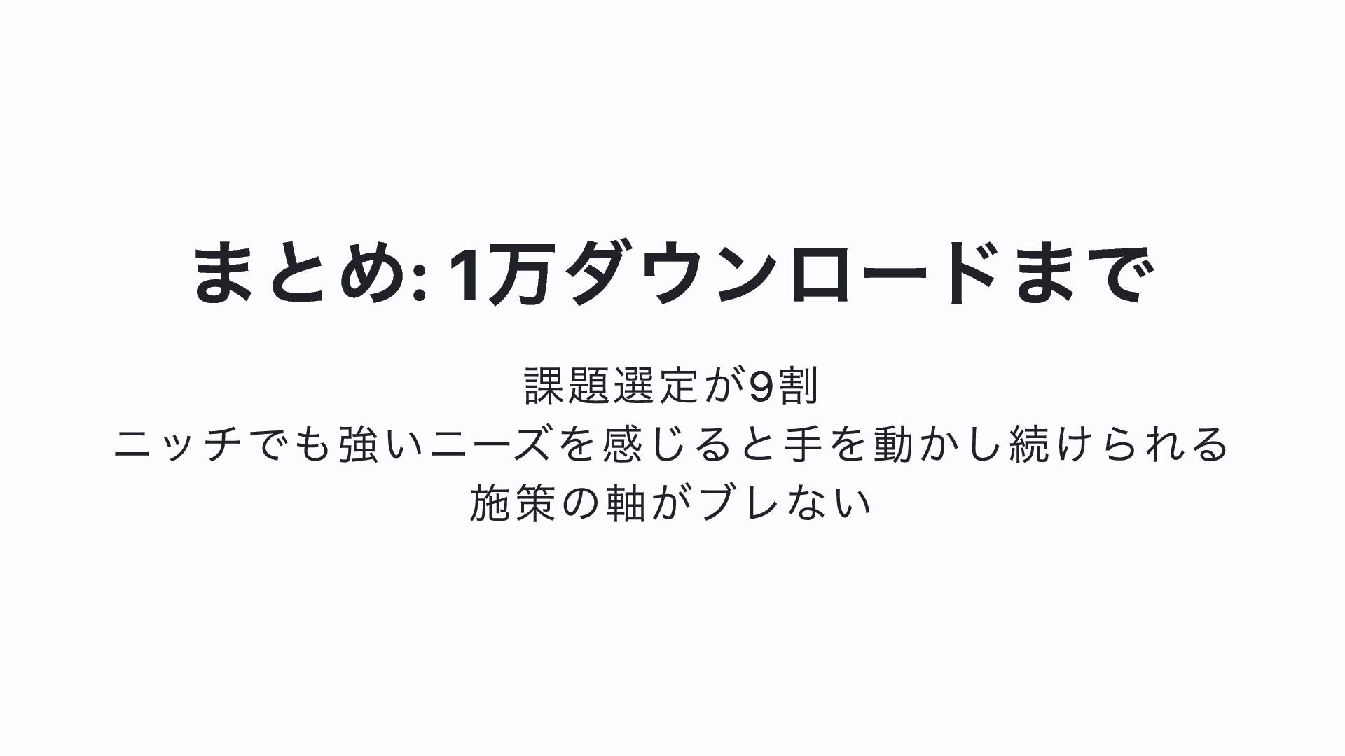 まとめ: 1万ダウンロードまで 課題選定が9割 ニッチでも強いニーズを感じると手を動かし続けられる 施策の軸がブレない