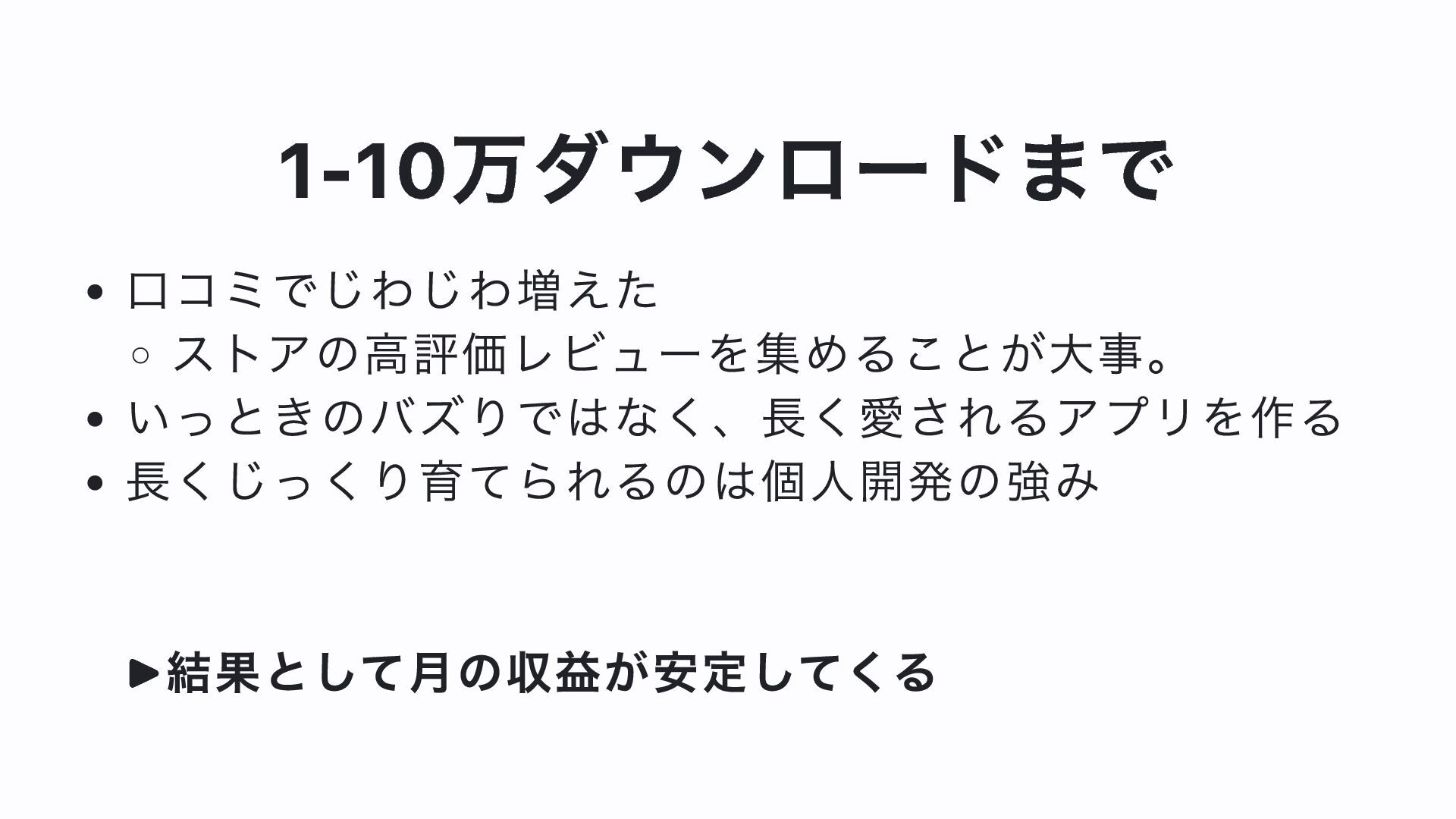 1-10万ダウンロードまで 口コミでじわじわ増えた ストアの高評価レビューを集めることが大事。 いっときのバズりではなく、長く愛されるアプリを作る 長くじっくり育てられるのは個人開発の強み ▶︎結果として月の収益が安定してくる
