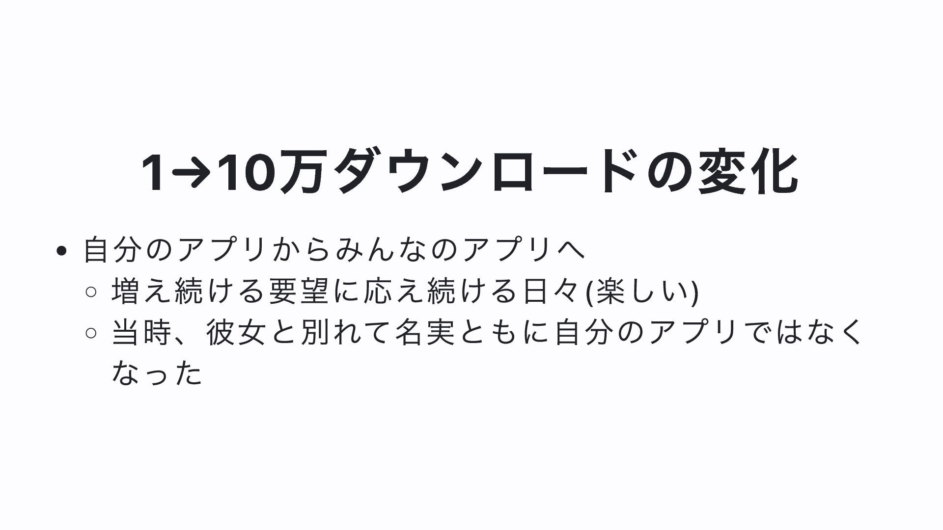 1→10万ダウンロードの変化 自分のアプリからみんなのアプリへ 増え続ける要望に応え続ける日々(楽しい) 当時、彼女と別れて名実ともに自分のアプリではなく なった