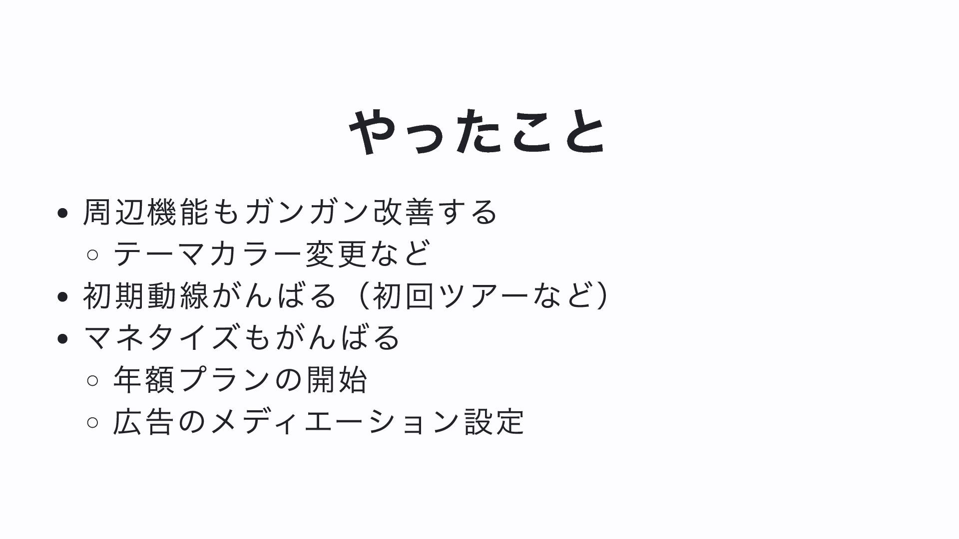 やったこと 周辺機能もガンガン改善する テーマカラー変更など 初期動線がんばる(初回ツアーなど) マネタイズもがんばる 年額プランの開始 広告のメディエーション設定