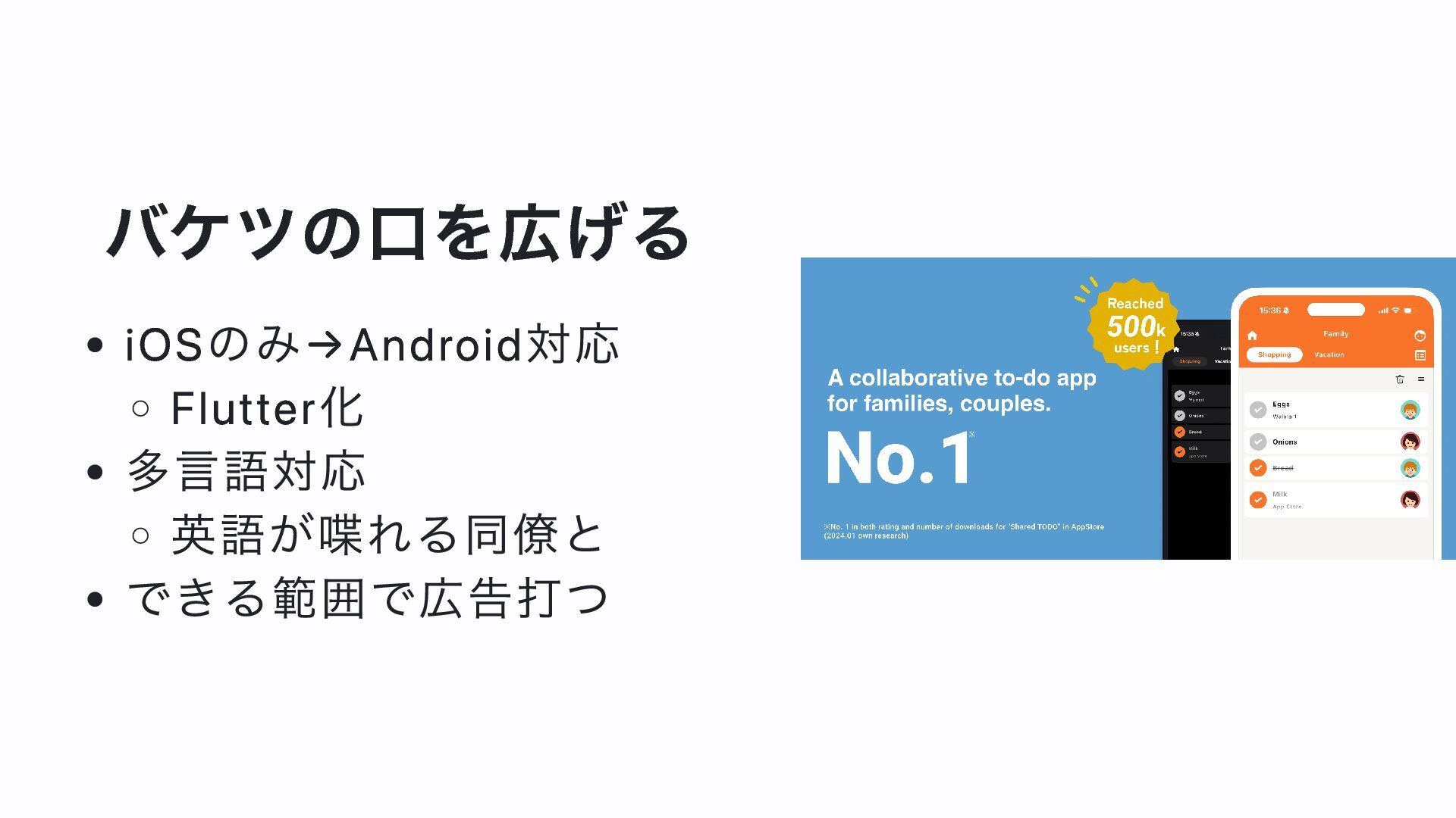 バケツの口を広げる iOSのみ→Android対応 Flutter化 多言語対応 英語が喋れる同僚と できる範囲で広告打つ
