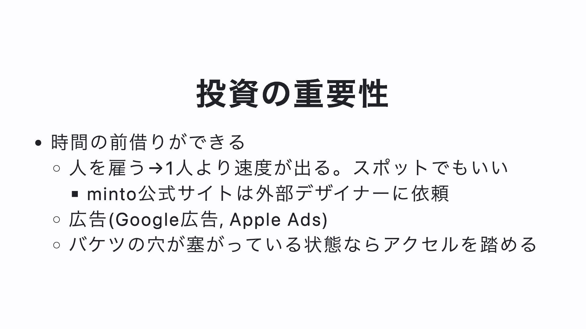 投資の重要性 時間の前借りができる 人を雇う→1人より速度が出る。スポットでもいい minto公式サイトは外部デザイナーに依頼 広告(Google広告, Apple Ads) バケツの穴が塞がっている状態ならアクセルを踏める