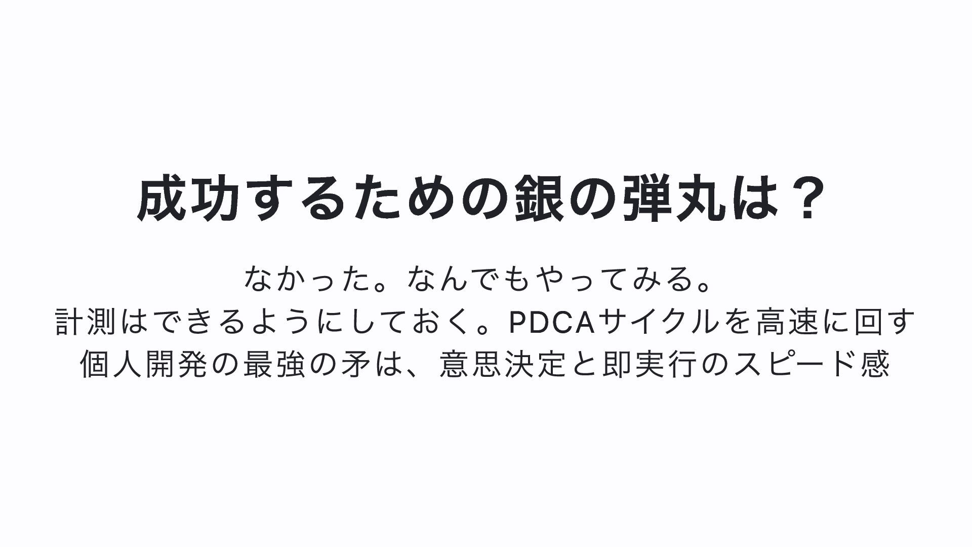 成功するための銀の弾丸は? なかった。なんでもやってみる。 計測はできるようにしておく。PDCAサイクルを高速に回す 個人開発の最強の矛は、意思決定と即実行のスピード感