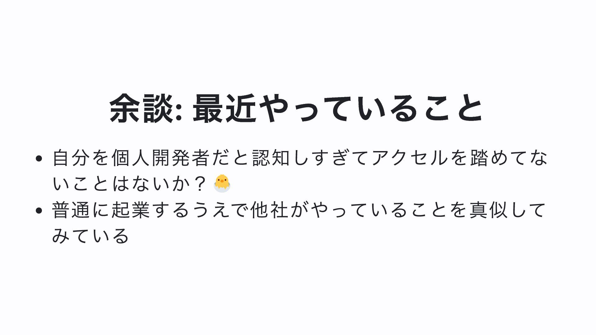 余談: 最近やっていること 自分を個人開発者だと認知しすぎてアクセルを踏めてな いことはないか? 普通に起業するうえで他社がやっていることを真似して みている