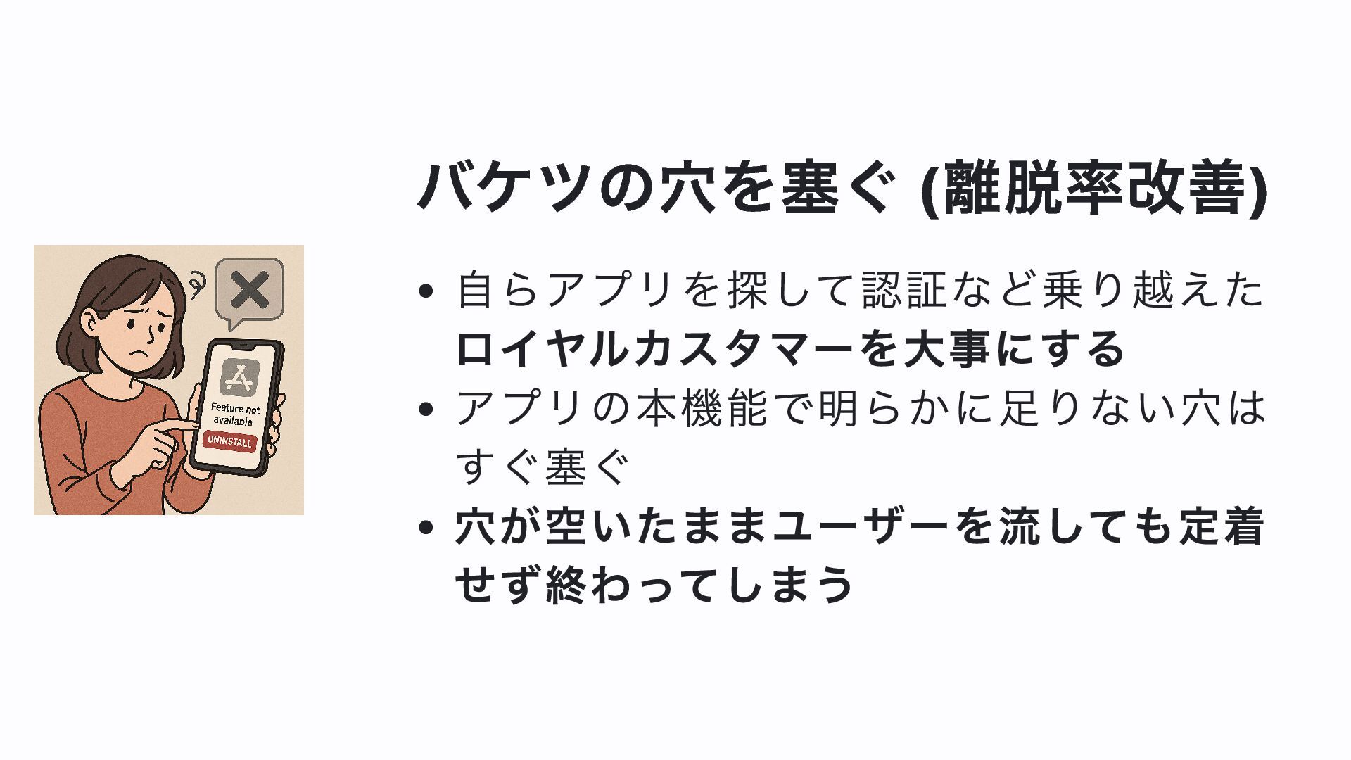 バケツの穴を塞ぐ (離脱率改善) 自らアプリを探して認証など乗り越えた ロイヤルカスタマーを大事にする アプリの本機能で明らかに足りない穴は すぐ塞ぐ 穴が空いたままユーザーを流しても定着 せず終わってしまう