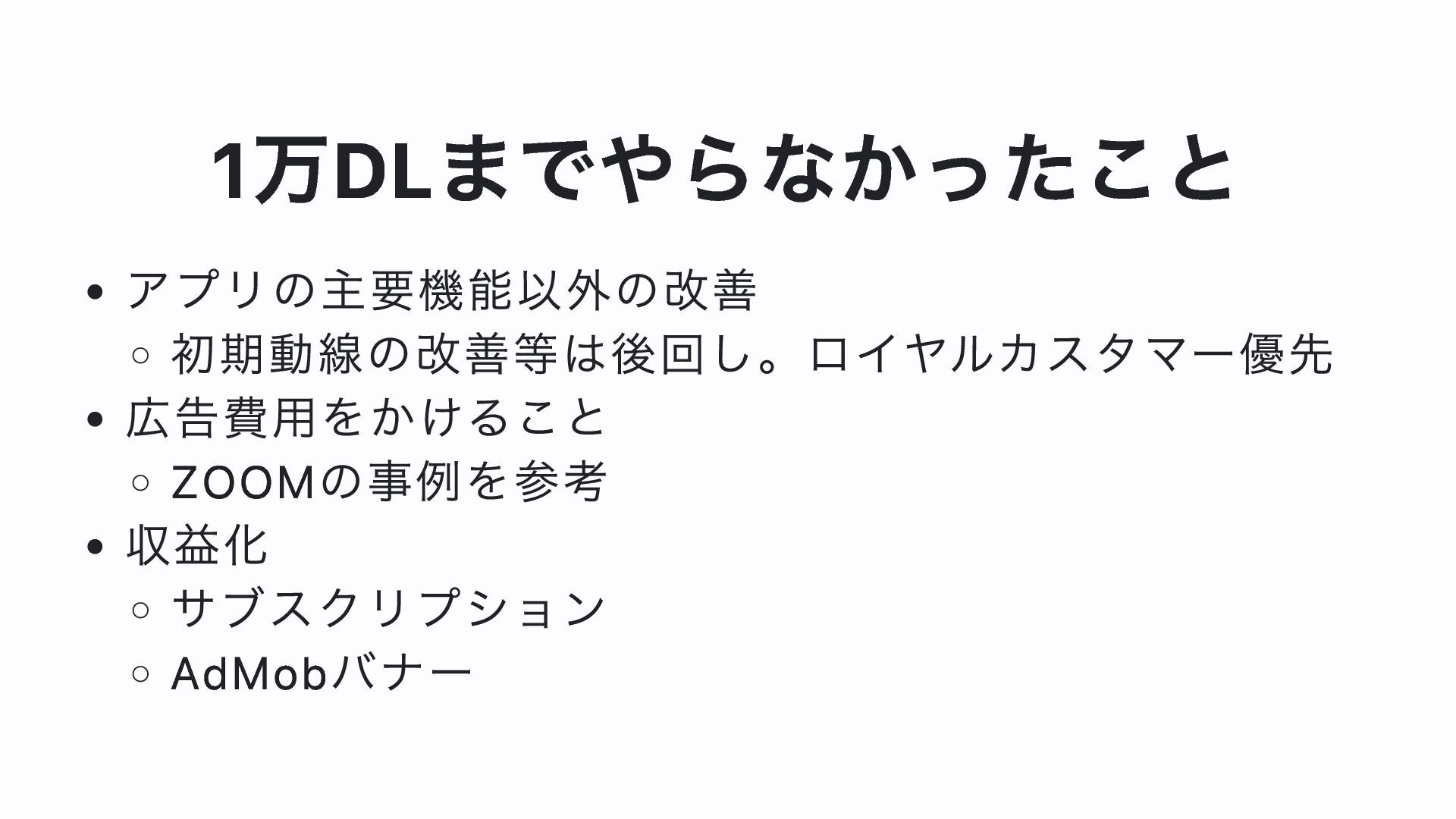 1万DLまでやらなかったこと アプリの主要機能以外の改善 初期動線の改善等は後回し。ロイヤルカスタマー優先 広告費用をかけること ZOOMの事例を参考 収益化 サブスクリプション AdMobバナー