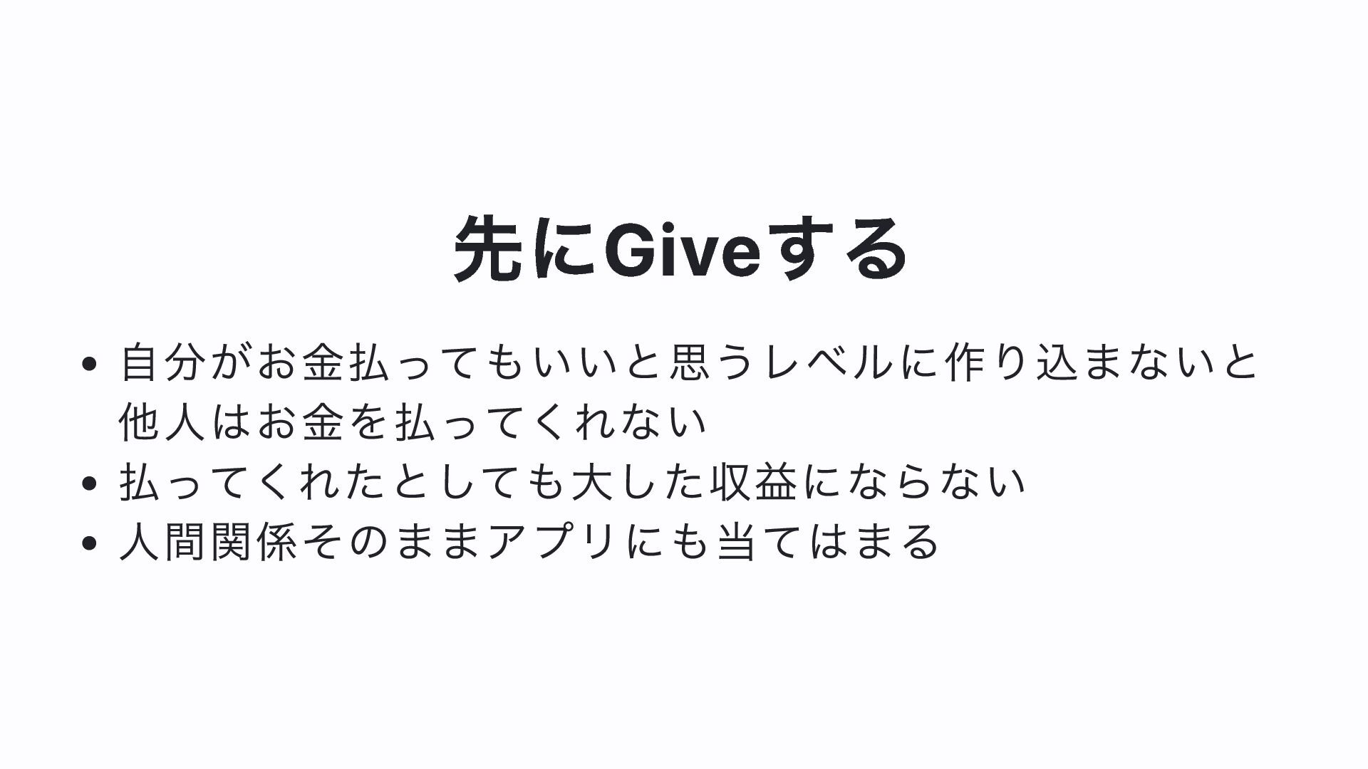 先にGiveする 自分がお金払ってもいいと思うレベルに作り込まないと 他人はお金を払ってくれない 払ってくれたとしても大した収益にならない 人間関係そのままアプリにも当てはまる