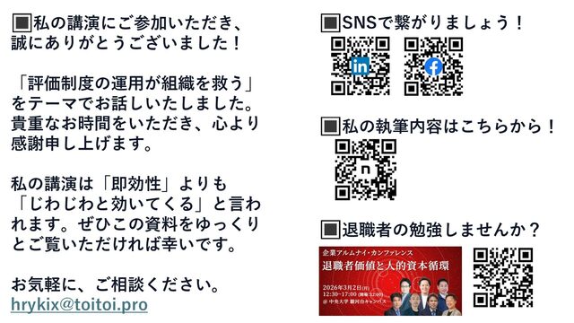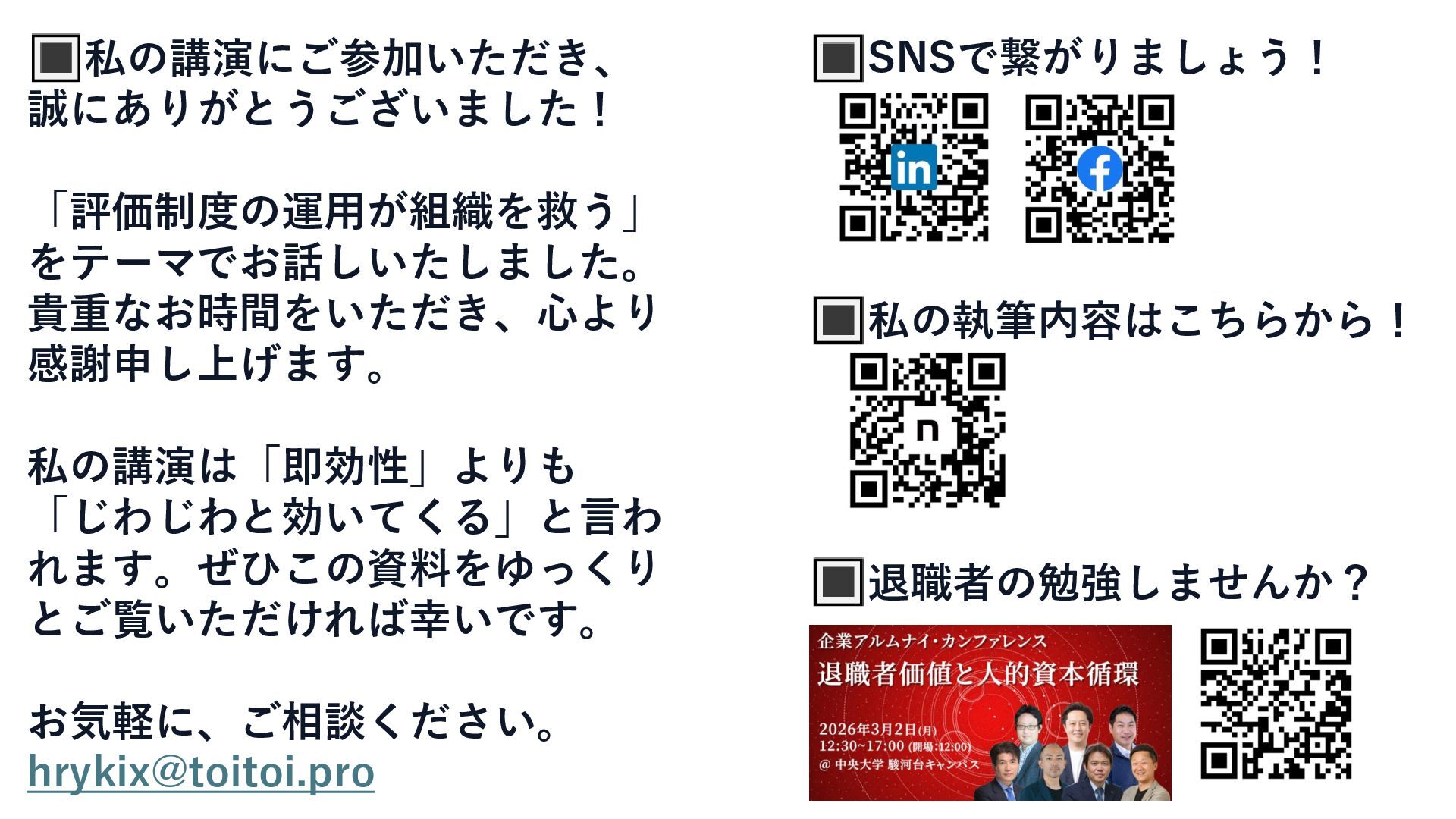 私の講演にご参加いただき、 誠にありがとうございました! 「評価制度の運用が組織を救う」 をテーマでお話しいたしました。 貴重なお時間をいただき、心より 感謝申し上げます。 私の講演は「即効性」よりも 「じわじわと効いてくる」と言わ れます。ぜひこの資料をゆっくり とご覧いただければ幸いです。