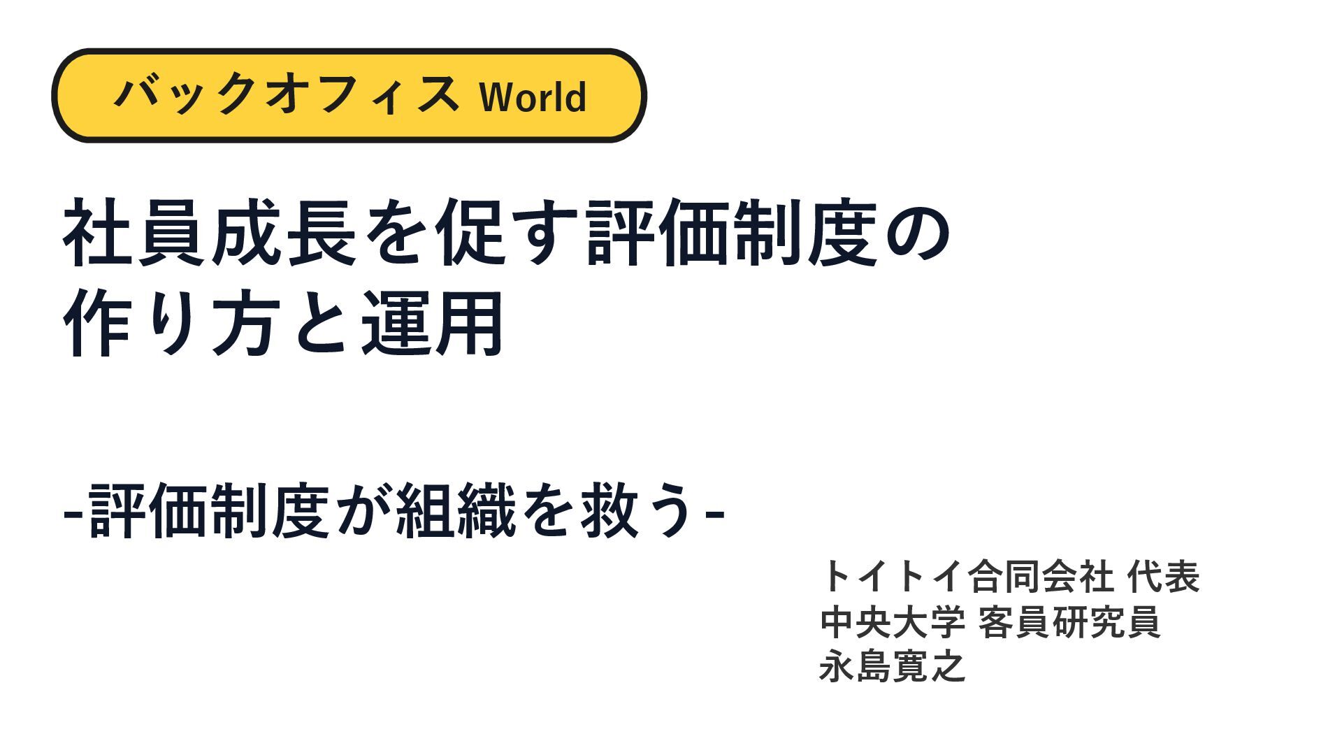 社員成長を促す評価制度の 作り方と運用 -評価制度が組織を救う- バックオフィス World トイトイ合同会社 代表 中央大学 客員研究員 永島寛之