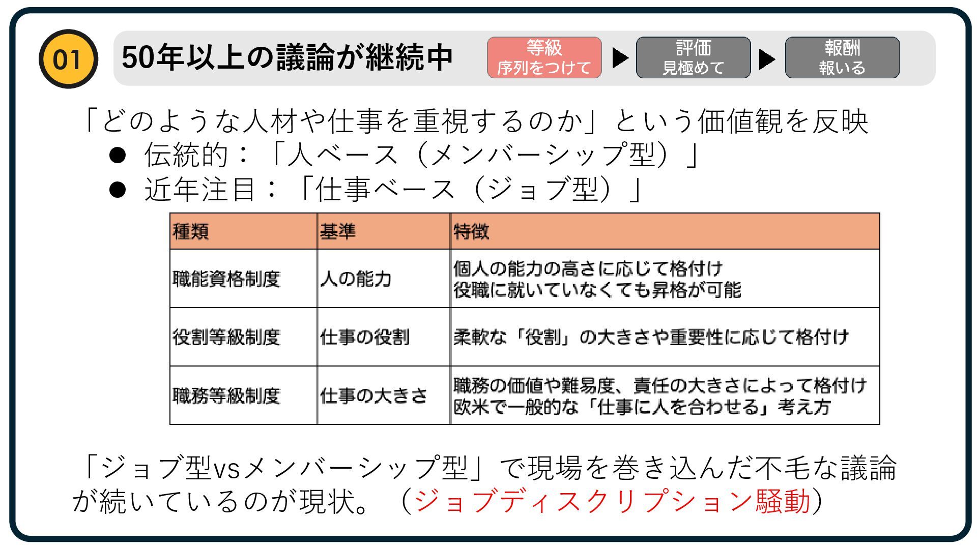 50年以上の議論が継続中 「どのような人材や仕事を重視するのか」という価値観を反映 ⚫ 伝統的:「人ベース(メンバーシップ型)」 ⚫ 近年注目:「仕事ベース(ジョブ型)」 「ジョブ型vsメンバーシップ型」で現場を巻き込んだ不毛な議論 が続いているのが現状。(ジョブディスクリプション騒動) 01