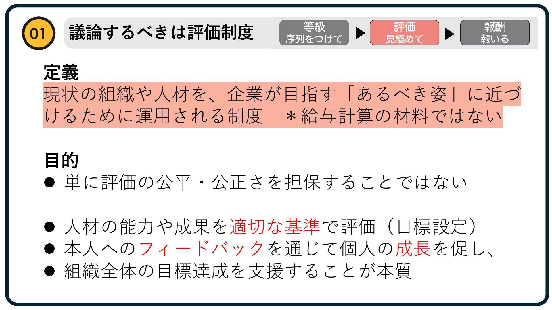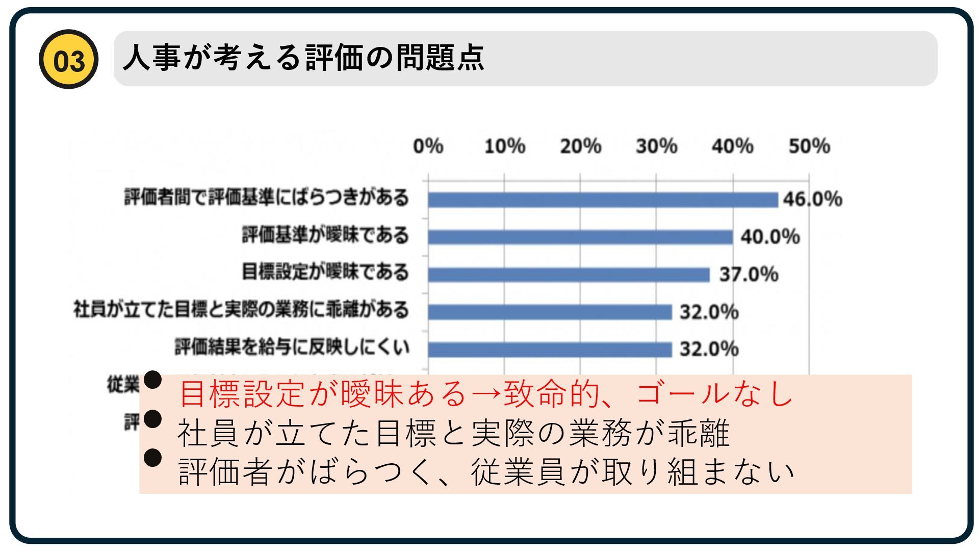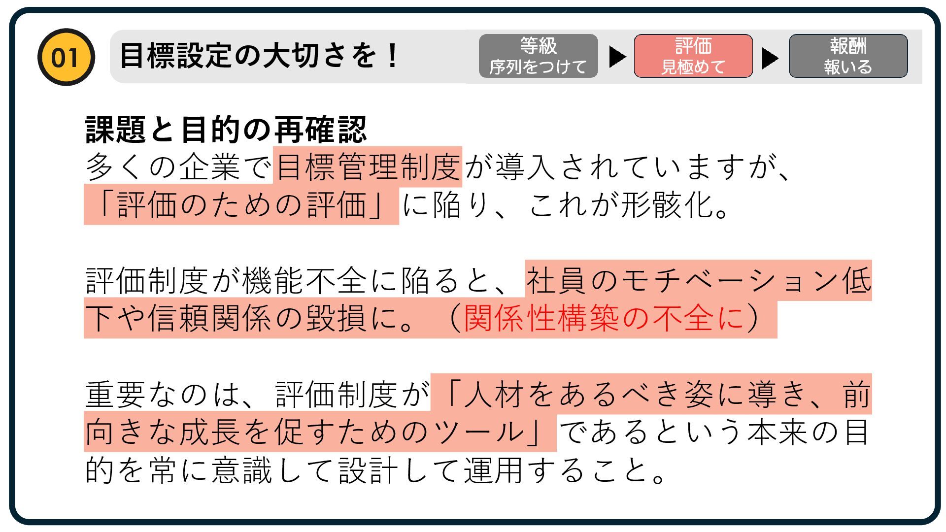 目標設定の大切さを! 課題と目的の再確認 多くの企業で目標管理制度が導入されていますが、 「評価のための評価」に陥り、これが形骸化。 評価制度が機能不全に陥ると、社員のモチベーション低 下や信頼関係の毀損に。(関係性構築の不全に) 重要なのは、評価制度が「人材をあるべき姿に導き、前 向きな成長を促すためのツール」であるという本来の目 的を常に意識して設計して運用すること。 01