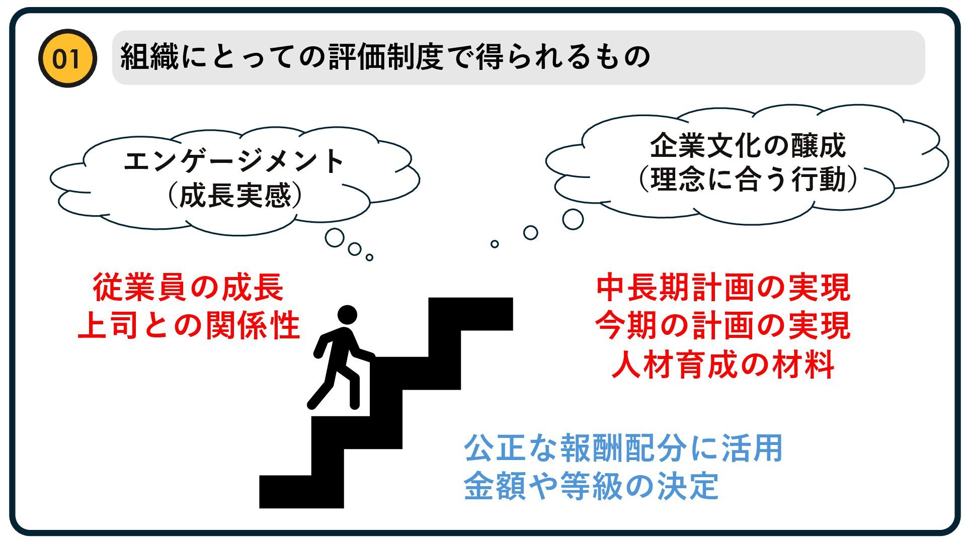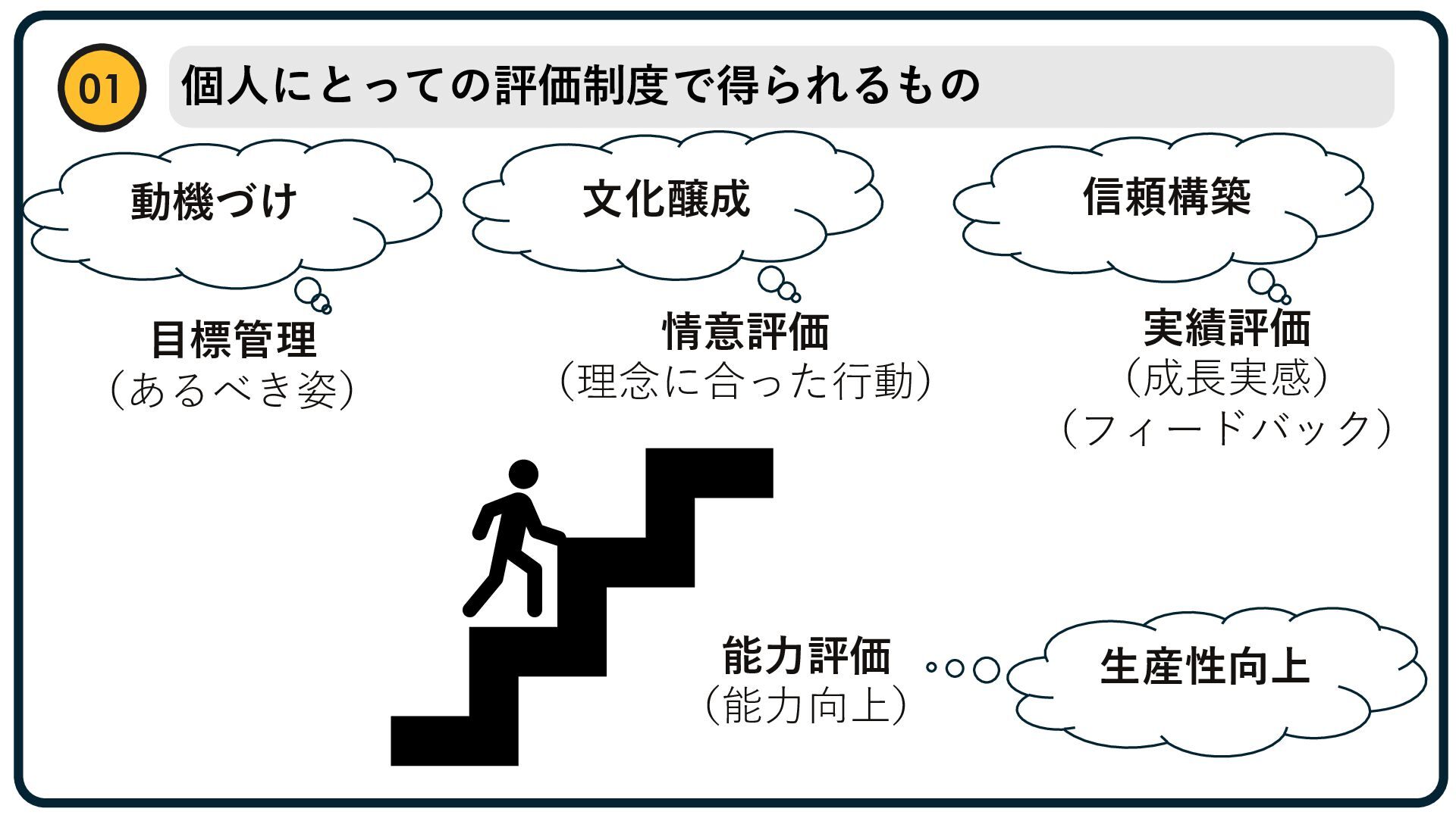 ⚫ 本人へのフィードバックを通じて個人の成長を促し、 ⚫ 組織全体の目標達成を支援することが本質 01