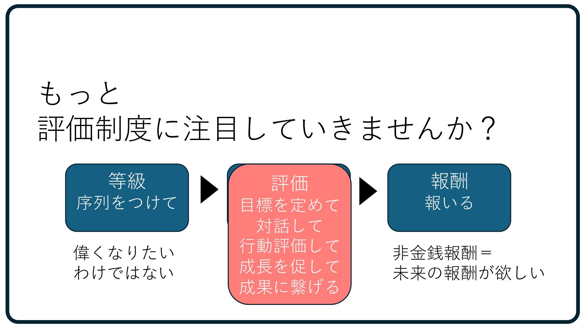 もっと 評価制度に注目していきませんか? 等級 序列をつけて 報酬 報いる 評価 見極めて 評価 目標を定めて