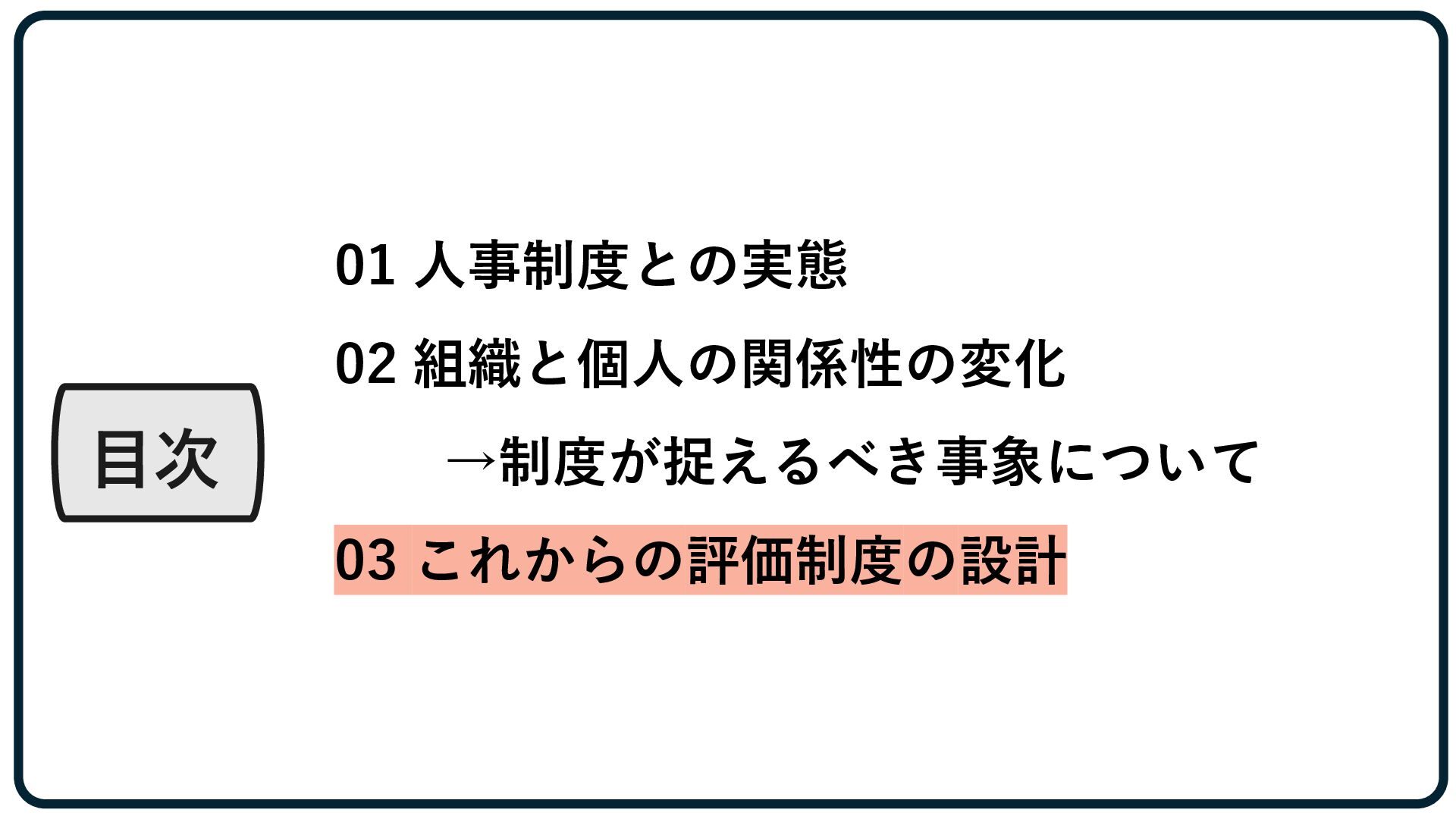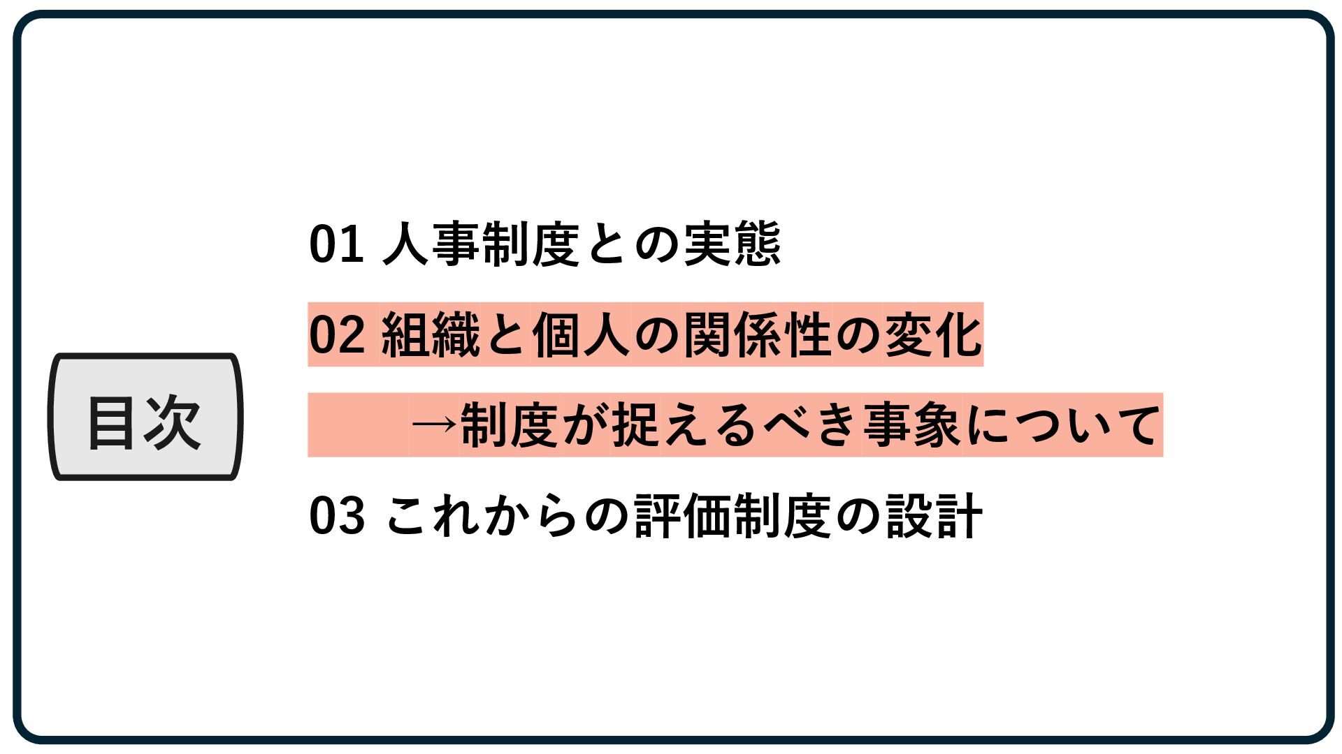 01 人事制度との実態 02 組織と個人の関係性の変化 →制度が捉えるべき事象について 03 これからの評価制度の設計 目次