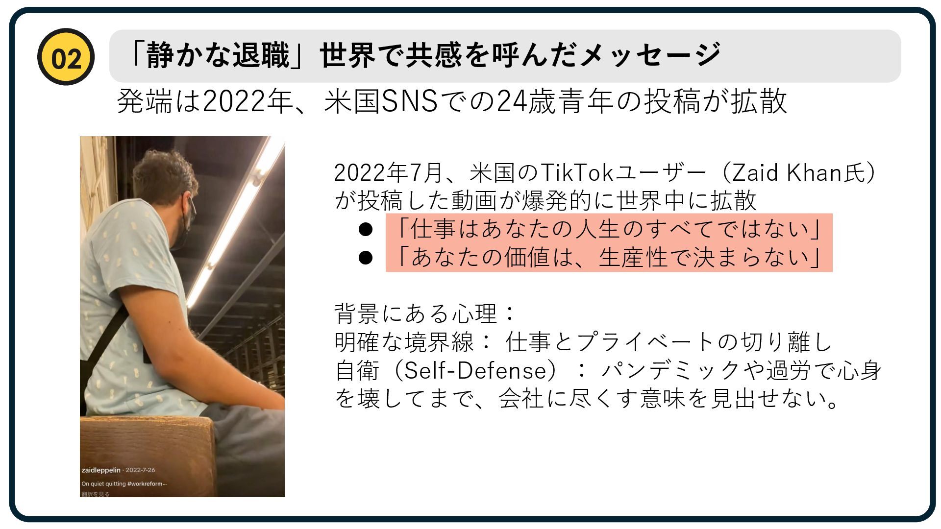 仕事とプライベートの切り離し 自衛(Self-Defense): パンデミックや過労で心身 を壊してまで、会社に尽くす意味を見出せない。 発端は2022年、米国SNSでの24歳青年の投稿が拡散 02