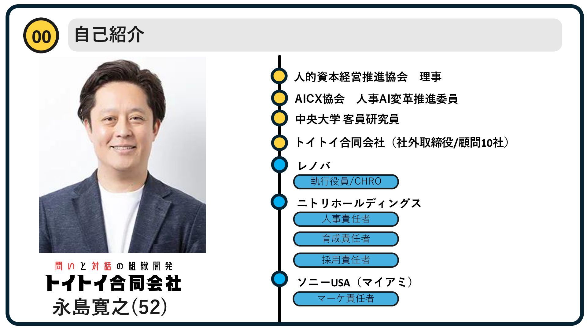 自己紹介 00 マーケ責任者 採用責任者 育成責任者 人事責任者 永島寛之(52) 執行役員/CHRO 人的資本経営推進協会 理事