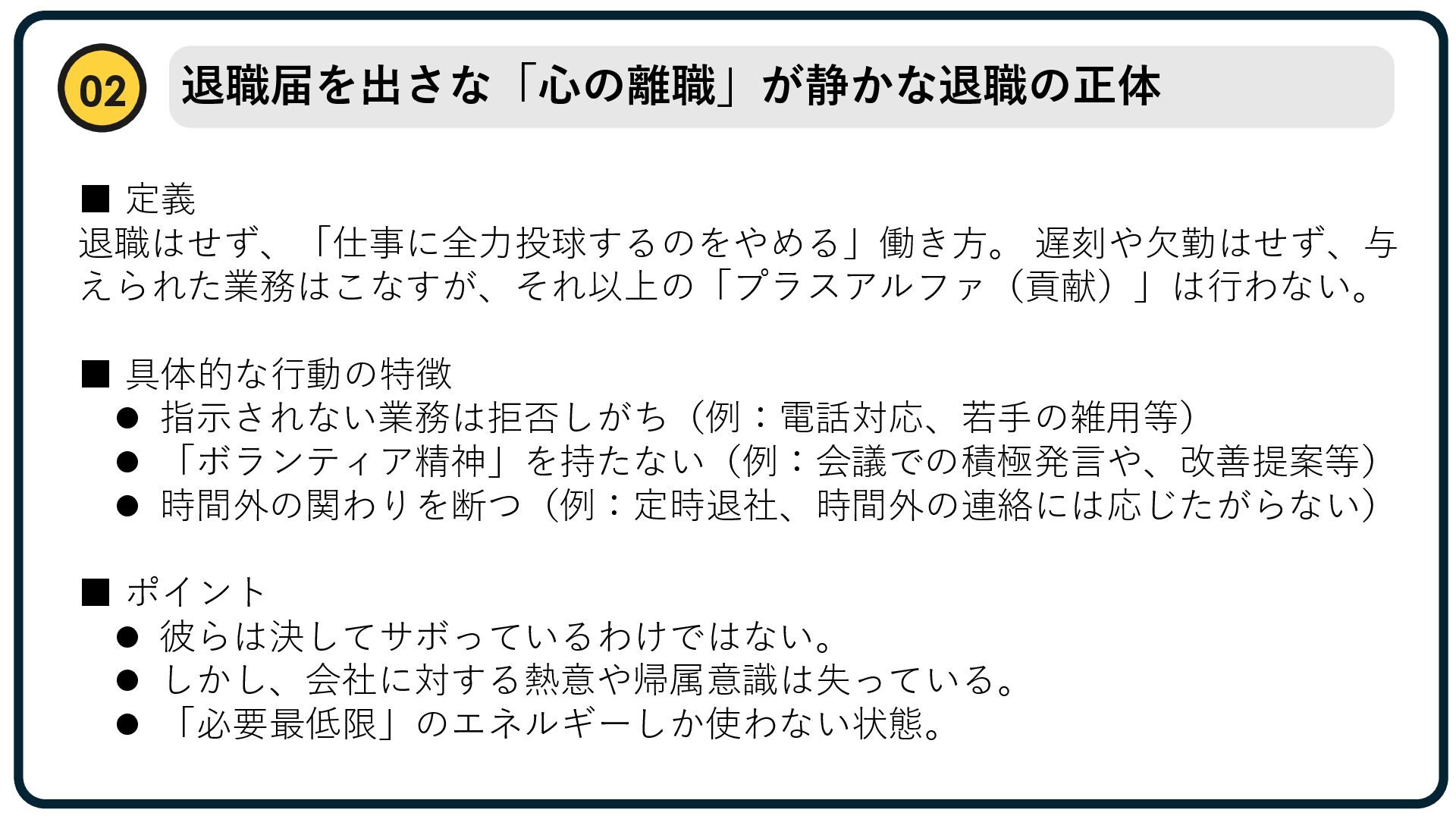 ⚫ 「ボランティア精神」を持たない(例:会議での積極発言や、改善提案等) ⚫ 時間外の関わりを断つ(例:定時退社、時間外の連絡には応じたがらない) ▪ ポイント ⚫ 彼らは決してサボっているわけではない。 ⚫ しかし、会社に対する熱意や帰属意識は失っている。 ⚫ 「必要最低限」のエネルギーしか使わない状態。 02