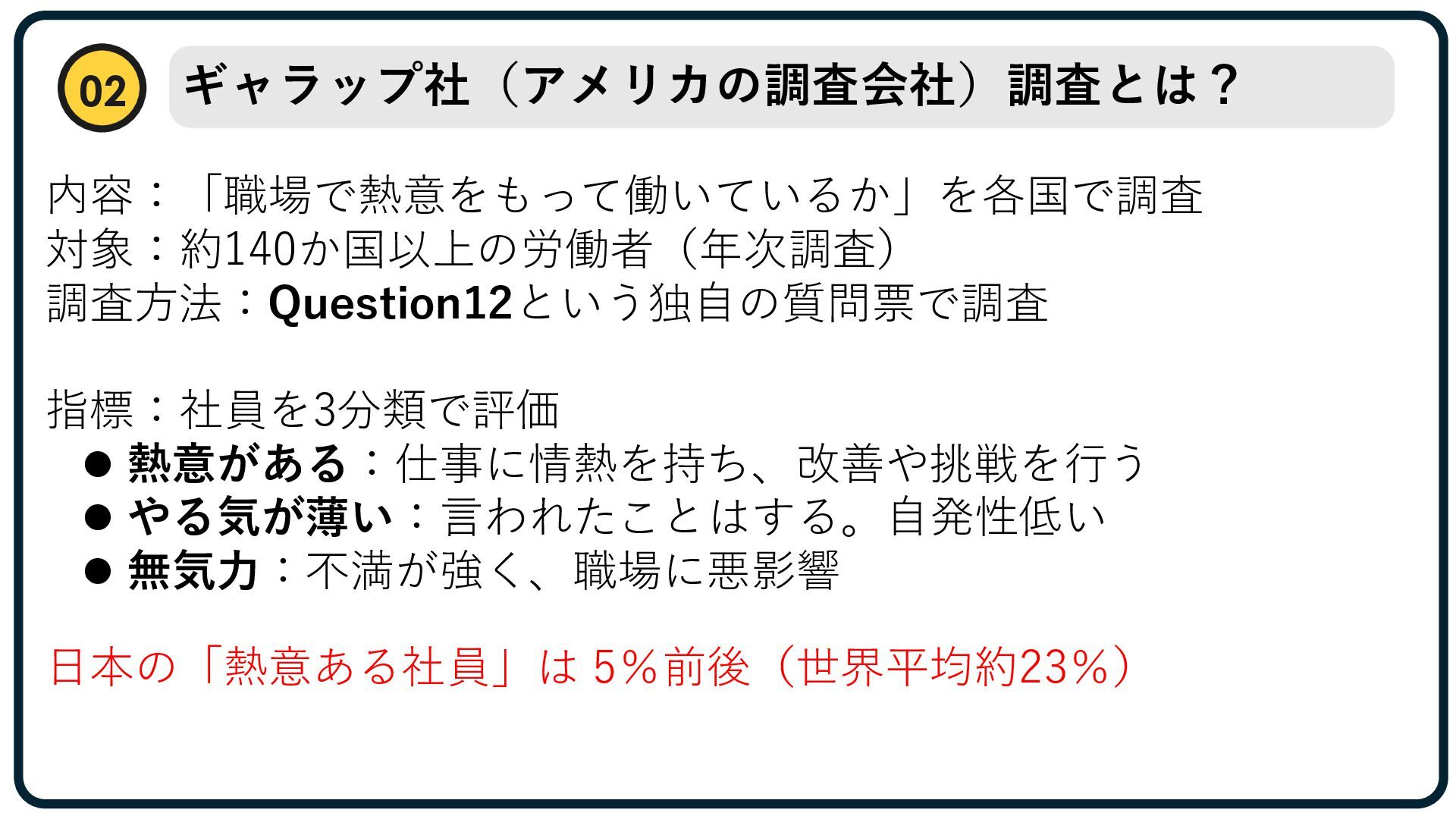 ギャラップ社(アメリカの調査会社)調査とは? 内容:「職場で熱意をもって働いているか」を各国で調査 対象:約140か国以上の労働者(年次調査) 調査方法:Question12という独自の質問票で調査 指標:社員を3分類で評価 ⚫ 熱意がある:仕事に情熱を持ち、改善や挑戦を行う ⚫ やる気が薄い:言われたことはする。自発性低い ⚫