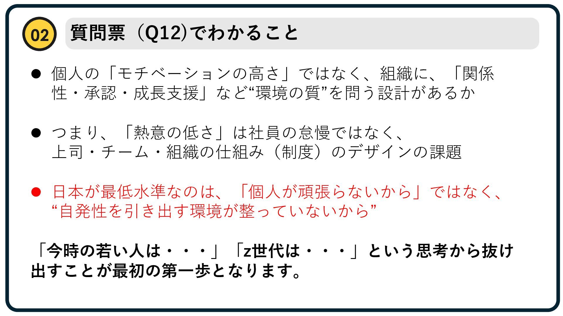 質問票(Q12)でわかること ⚫ 個人の「モチベーションの高さ」ではなく、組織に、「関係 性・承認・成長支援」など“環境の質”を問う設計があるか ⚫ つまり、「熱意の低さ」は社員の怠慢ではなく、 上司・チーム・組織の仕組み(制度)のデザインの課題 ⚫ 日本が最低水準なのは、「個人が頑張らないから」ではなく、 “自発性を引き出す環境が整っていないから”
