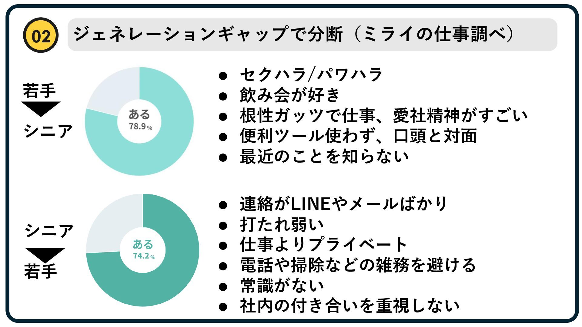 ジェネレーションギャップで分断(ミライの仕事調べ) 02 ⚫ セクハラ/パワハラ ⚫ 飲み会が好き ⚫ 根性ガッツで仕事、愛社精神がすごい ⚫ 便利ツール使わず、口頭と対面