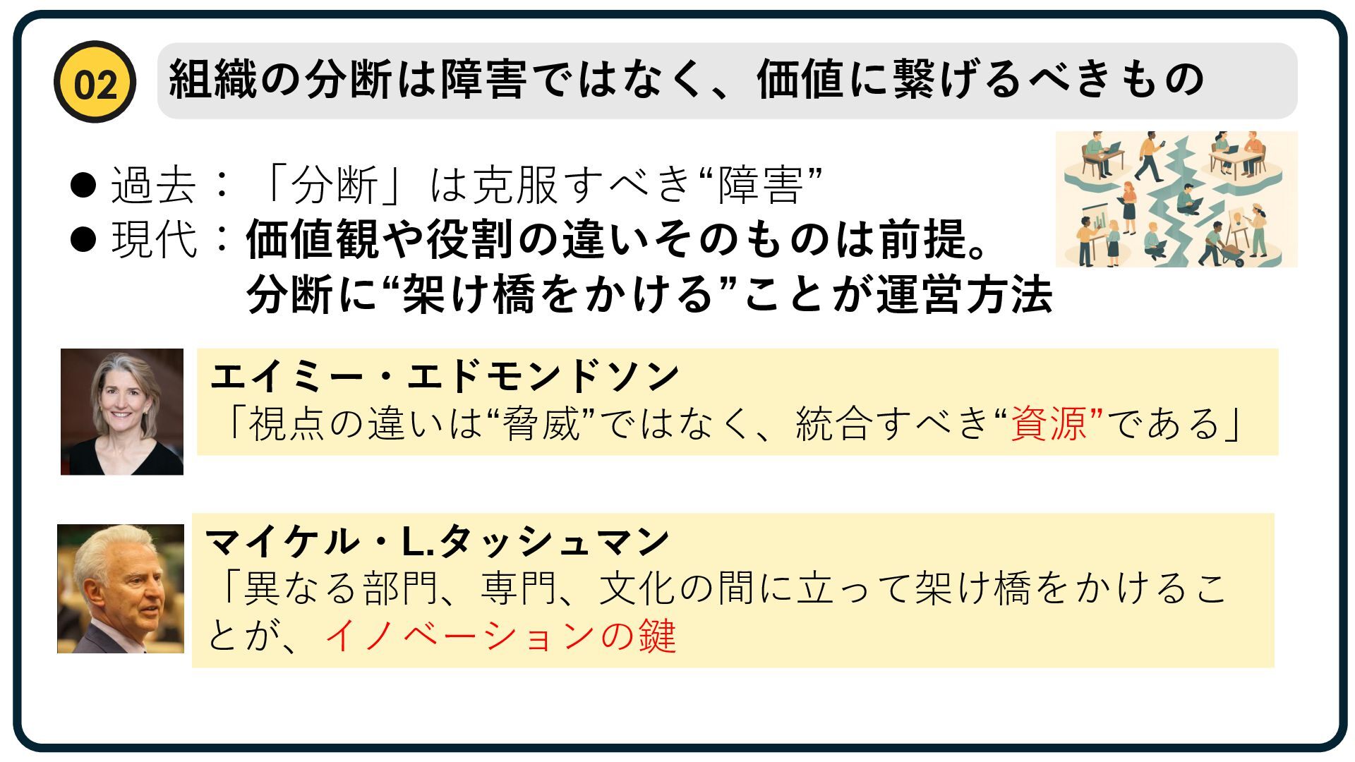 組織の分断は障害ではなく、価値に繋げるべきもの ⚫ 過去:「分断」は克服すべき“障害” ⚫ 現代:価値観や役割の違いそのものは前提。 分断に“架け橋をかける”ことが運営方法 エイミー・エドモンドソン 「視点の違いは“脅威”ではなく、統合すべき“資源”である」 マイケル・L.タッシュマン 「異なる部門、専門、文化の間に立って架け橋をかけるこ