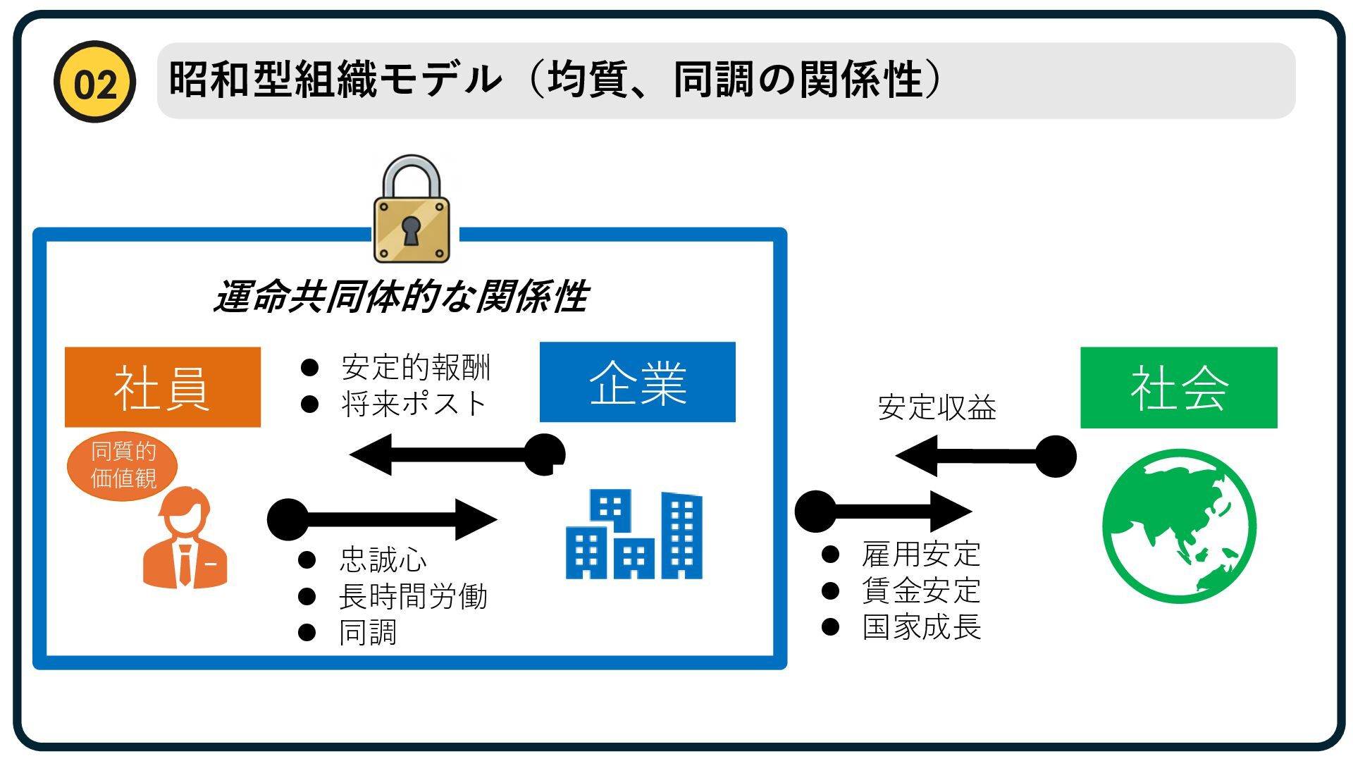 昭和型組織モデル(均質、同調の関係性) 02 ⚫ 安定的報酬 ⚫ 将来ポスト ⚫ 忠誠心 ⚫ 長時間労働