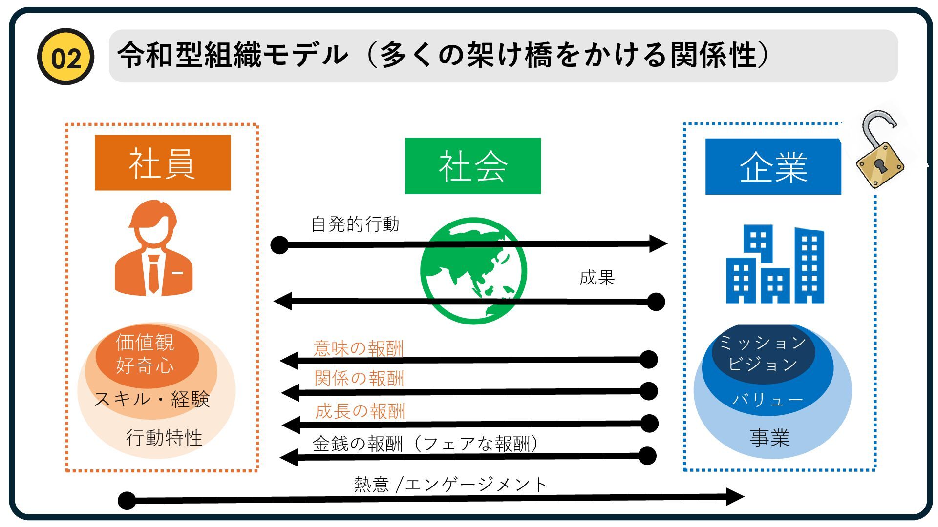 令和型組織モデル(多くの架け橋をかける関係性) 02 価値観 好奇心 スキル・経験 行動特性 社員 社会 企業 ミッション