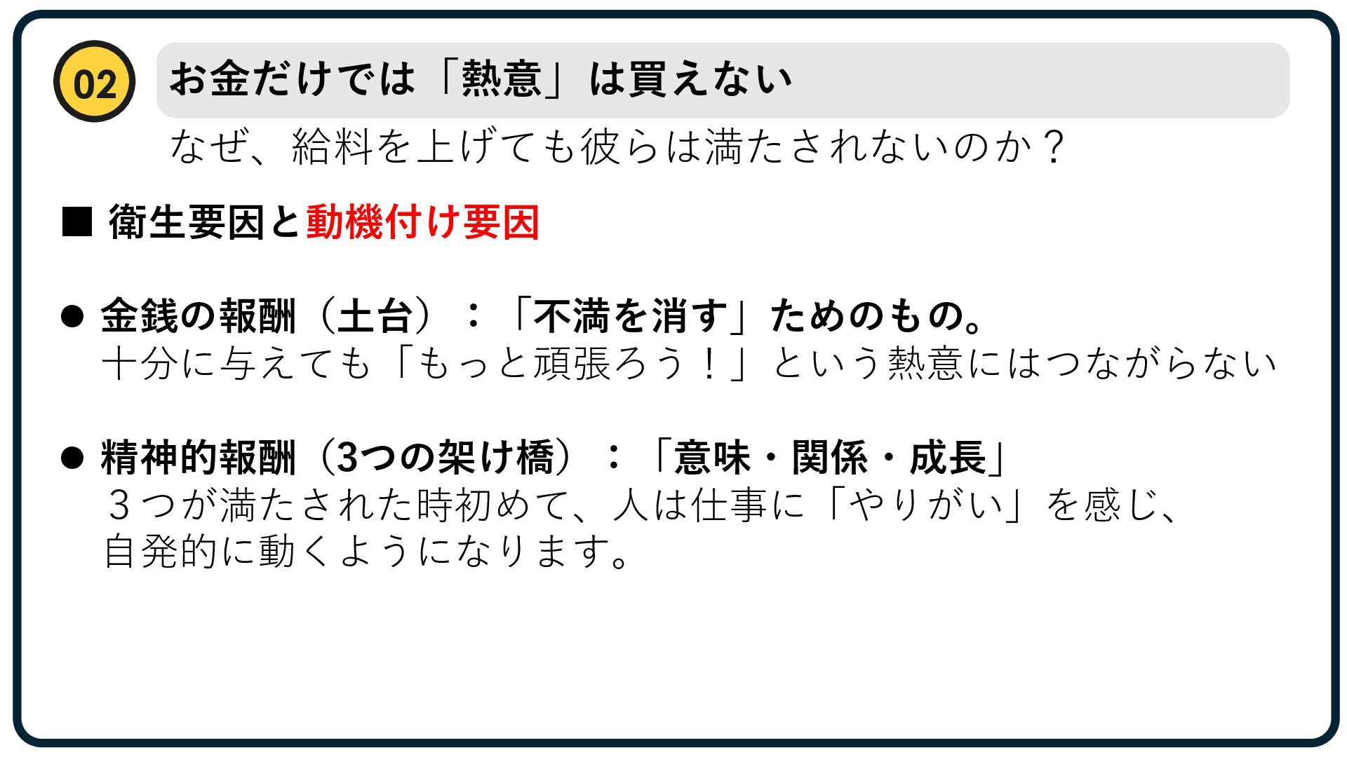 お金だけでは「熱意」は買えない 02 なぜ、給料を上げても彼らは満たされないのか? ▪ 衛生要因と動機付け要因 ⚫ 金銭の報酬(土台):「不満を消す」ためのもの。 十分に与えても「もっと頑張ろう!」という熱意にはつながらない ⚫ 精神的報酬(3つの架け橋):「意味・関係・成長」