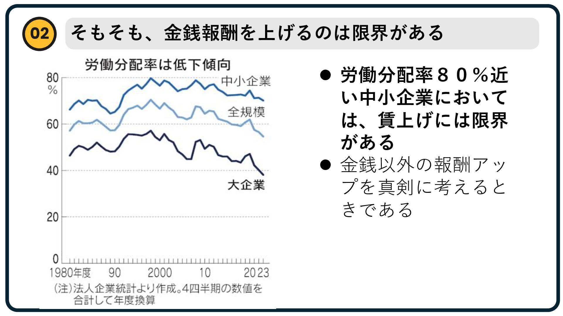 そもそも、金銭報酬を上げるのは限界がある ⚫ 労働分配率80%近 い中小企業において は、賃上げには限界 がある ⚫ 金銭以外の報酬アッ プを真剣に考えると きである
