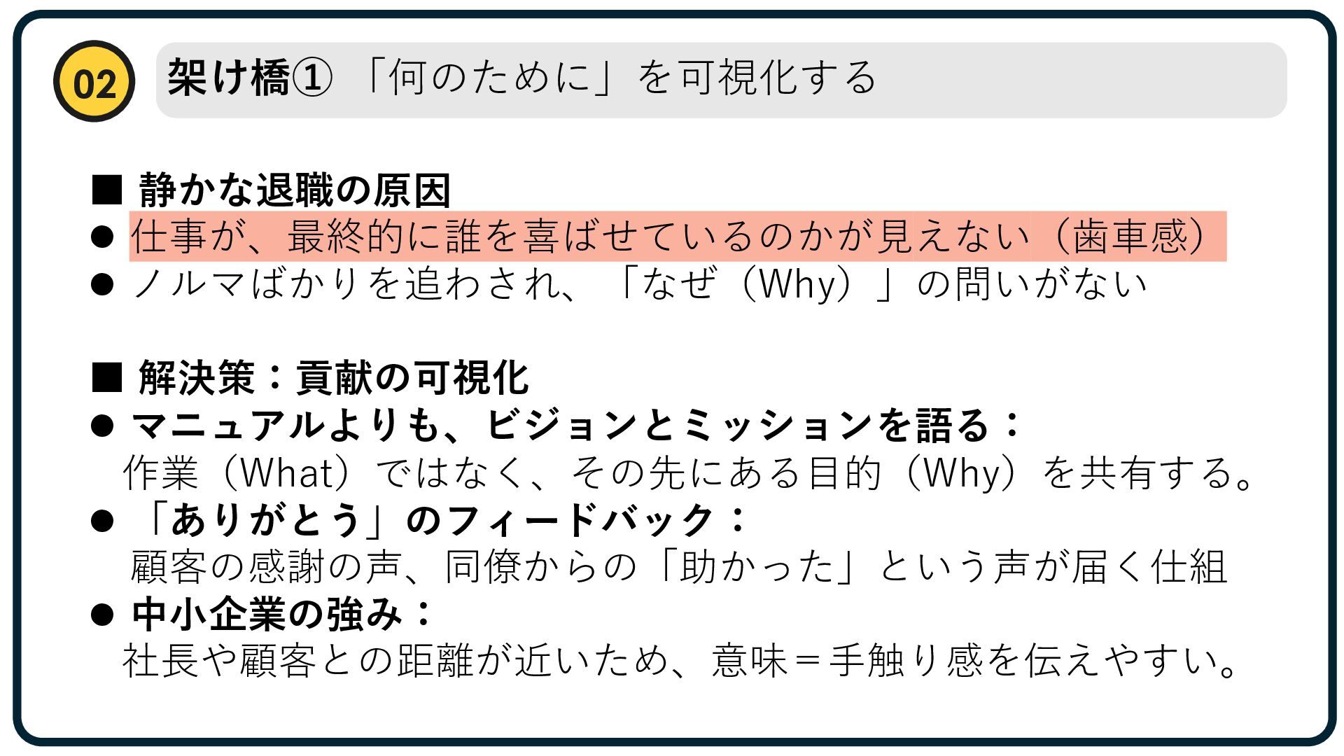 架け橋① 「何のために」を可視化する 02 ▪ 静かな退職の原因 ⚫ 仕事が、最終的に誰を喜ばせているのかが見えない(歯車感) ⚫ ノルマばかりを追わされ、「なぜ(Why)」の問いがない ▪