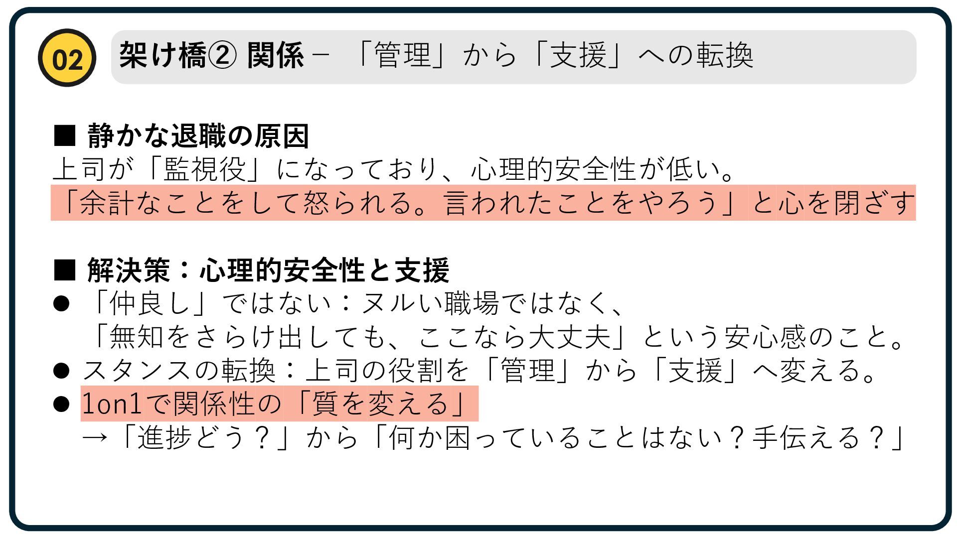 架け橋② 関係- 「管理」から「支援」への転換 02 ▪ 静かな退職の原因 上司が「監視役」になっており、心理的安全性が低い。 「余計なことをして怒られる。言われたことをやろう」と心を閉ざす ▪ 解決策:心理的安全性と支援