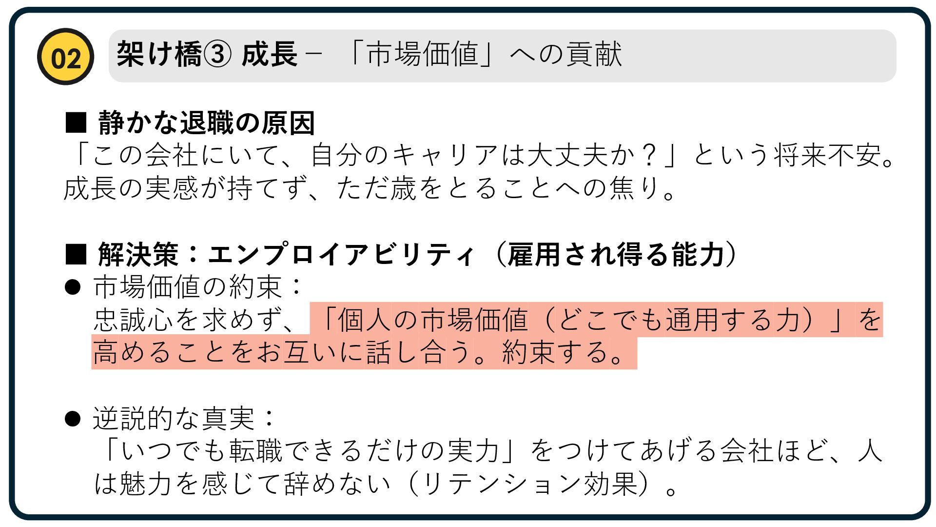 架け橋③ 成長- 「市場価値」への貢献 02 ▪ 静かな退職の原因 「この会社にいて、自分のキャリアは大丈夫か?」という将来不安。 成長の実感が持てず、ただ歳をとることへの焦り。 ▪ 解決策:エンプロイアビリティ(雇用され得る能力)