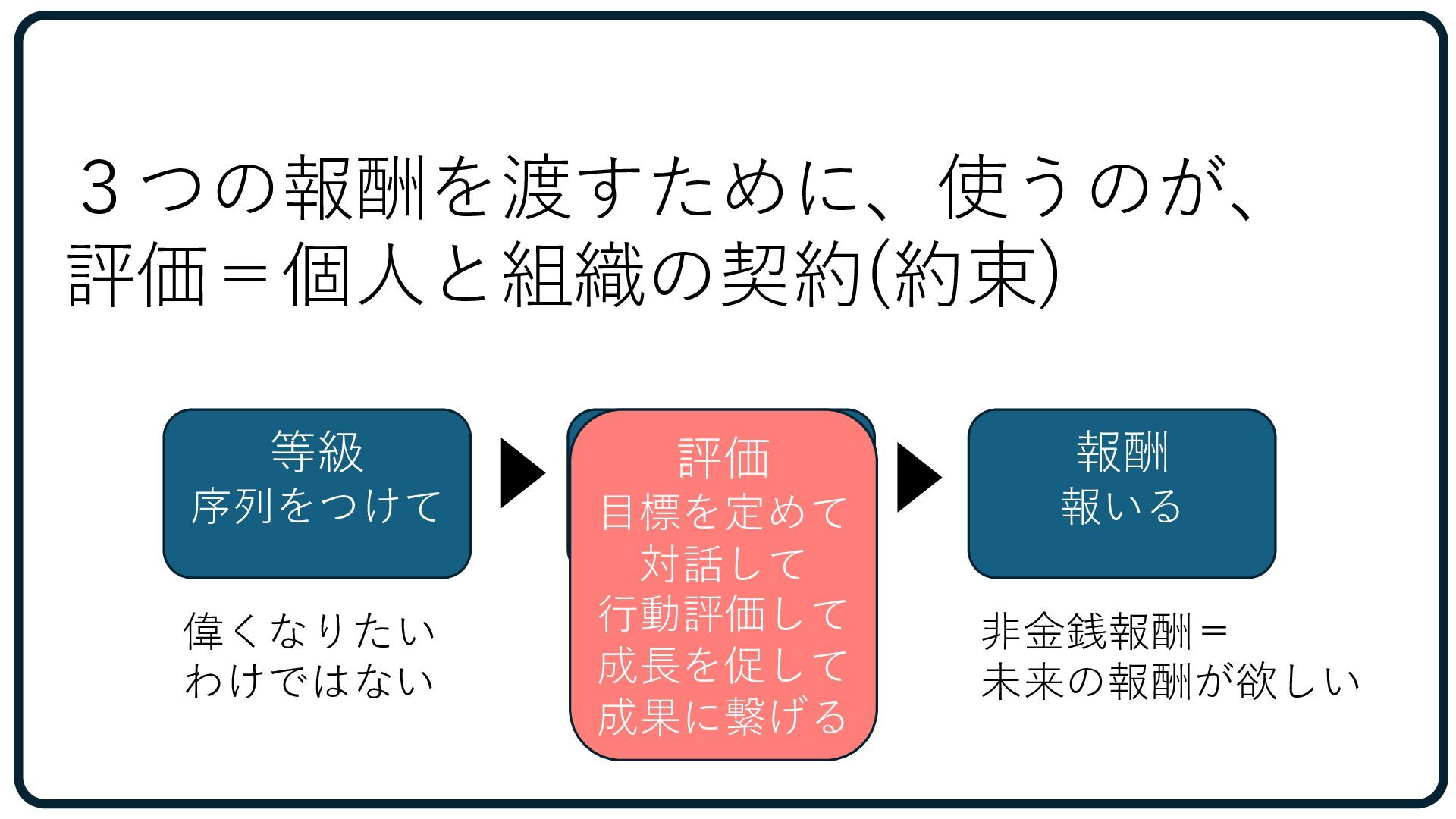 3つの報酬を渡すために、使うのが、 評価=個人と組織の契約(約束) 等級 序列をつけて 報酬 報いる 評価 見極めて 評価 目標を定めて