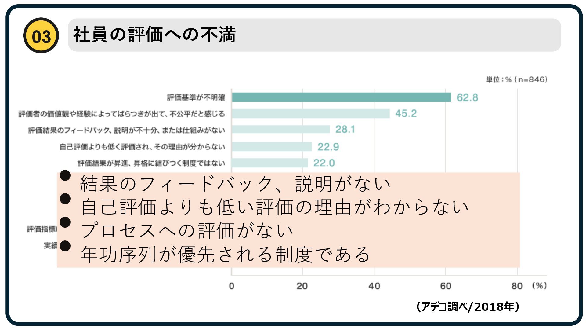 社員の評価への不満 03 •結果のフィードバック、説明がない •自己評価よりも低い評価の理由がわからない •プロセスへの評価がない •年功序列が優先される制度である (アデコ調べ/2018年)