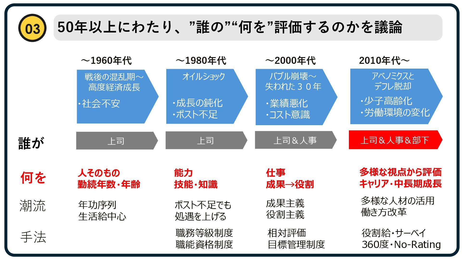 50年以上にわたり、”誰の”“何を”評価するのかを議論 03 戦後の混乱期〜 高度経済成長 オイルショック バブル崩壊〜 失われた30年 アベノミクスと デフレ脱却 〜1960年代