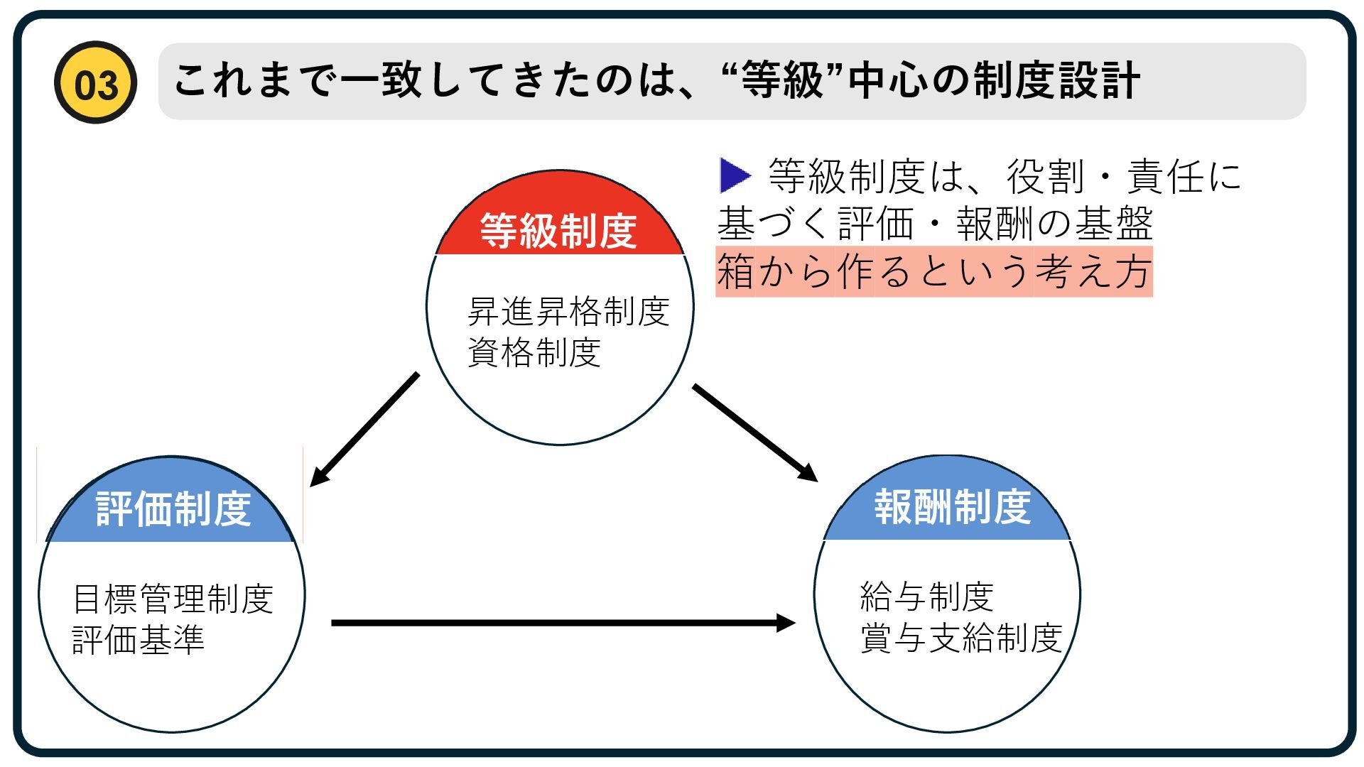 これまで一致してきたのは、“等級”中心の制度設計 03 等級制度 昇進昇格制度 資格制度 報酬制度 給与制度 賞与支給制度 評価制度 目標管理制度
