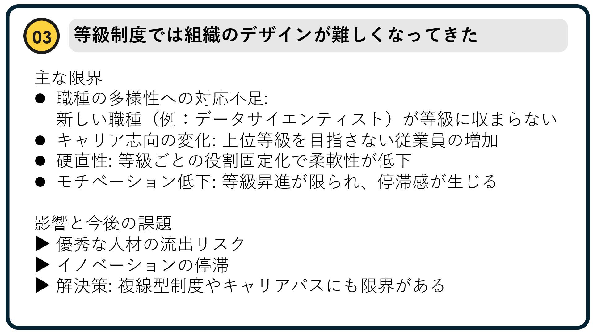 硬直性: 等級ごとの役割固定化で柔軟性が低下 ⚫ モチベーション低下: 等級昇進が限られ、停滞感が生じる 影響と今後の課題 優秀な人材の流出リスク イノベーションの停滞 解決策: 複線型制度やキャリアパスにも限界がある