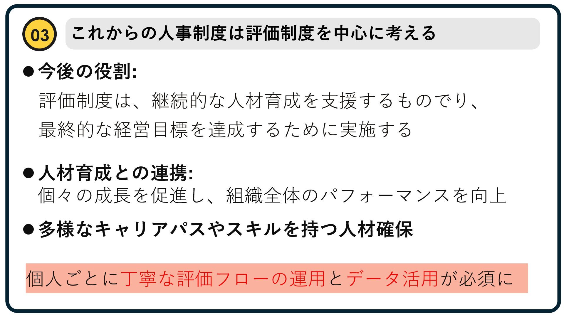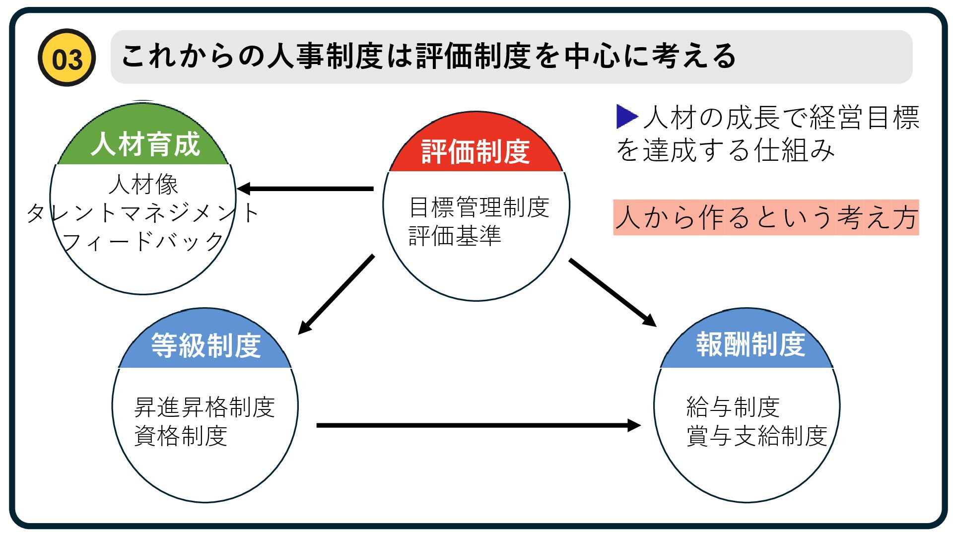 これからの人事制度は評価制度を中心に考える 03 評価制度 報酬制度 給与制度 賞与支給制度 等級制度 目標管理制度 評価基準 昇進昇格制度