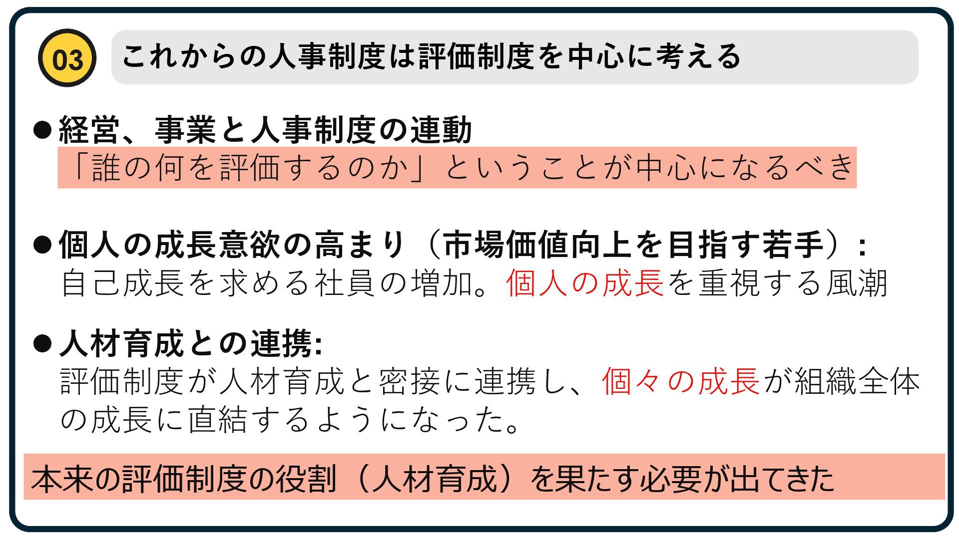 これからの人事制度は評価制度を中心に考える 03 ⚫経営、事業と人事制度の連動 「誰の何を評価するのか」ということが中心になるべき ⚫個人の成長意欲の高まり(市場価値向上を目指す若手): 自己成長を求める社員の増加。個人の成長を重視する風潮 ⚫人材育成との連携: 評価制度が人材育成と密接に連携し、個々の成長が組織全体 の成長に直結するようになった。 本来の評価制度の役割(人材育成)を果たす必要が出てきた