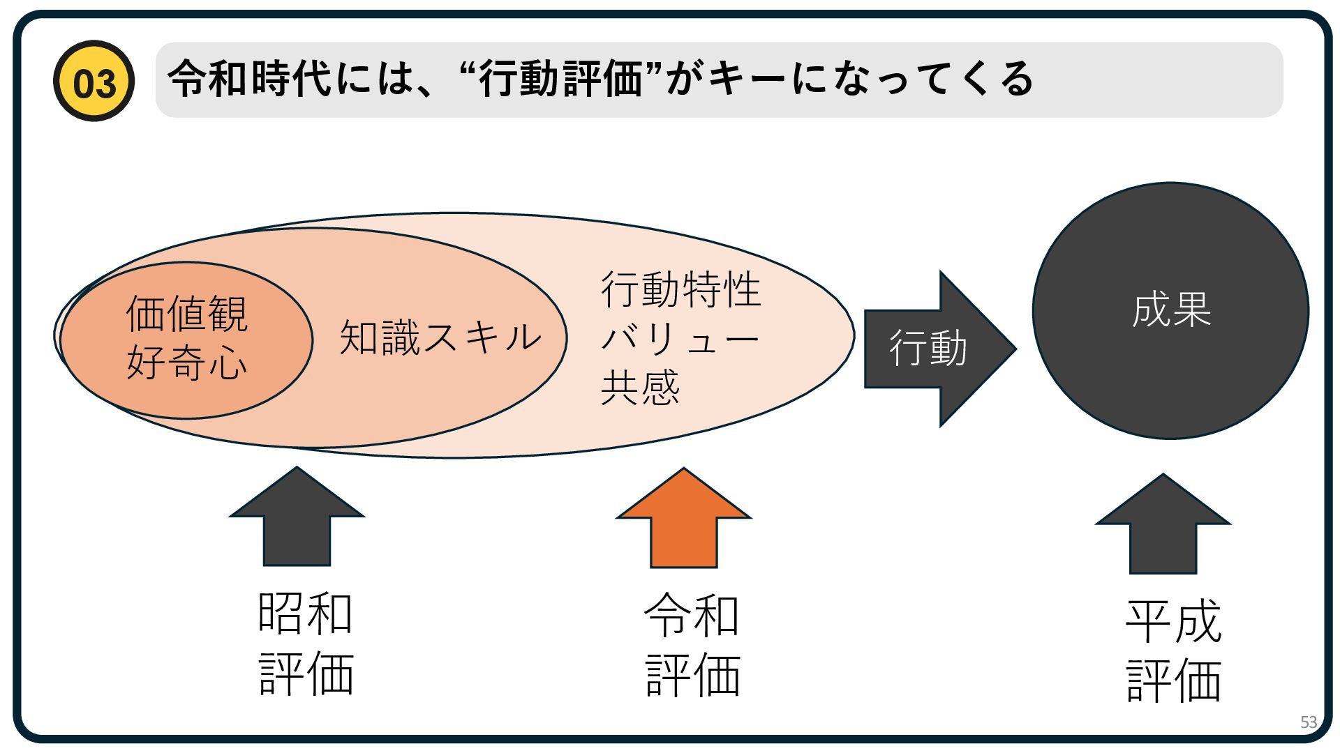 令和時代には、“行動評価”がキーになってくる 03 価値観 好奇心 知識スキル 行動特性 バリュー 共感 行動 成果