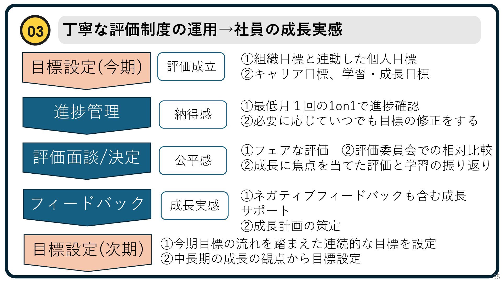 丁寧な評価制度の運用→社員の成長実感 03 目標設定(今期) 進捗管理 評価面談/決定 フィードバック 目標設定(次期) ①最低月1回の1on1で進捗確認 ②必要に応じていつでも目標の修正をする ①組織目標と連動した個人目標