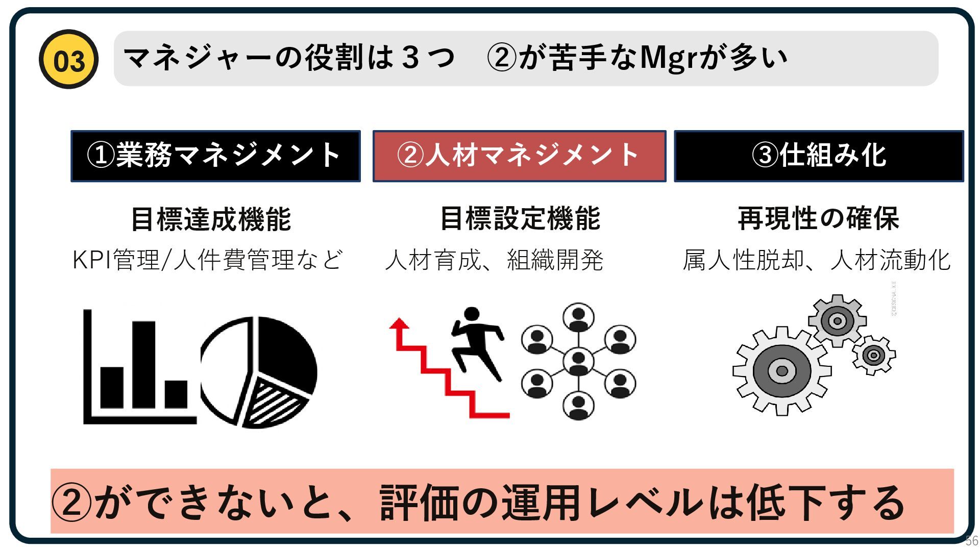 マネジャーの役割は3つ ②が苦手なMgrが多い 03 56 ①業務マネジメント ②人材マネジメント ③仕組み化 目標達成機能 目標設定機能 KPI管理/人件費管理など