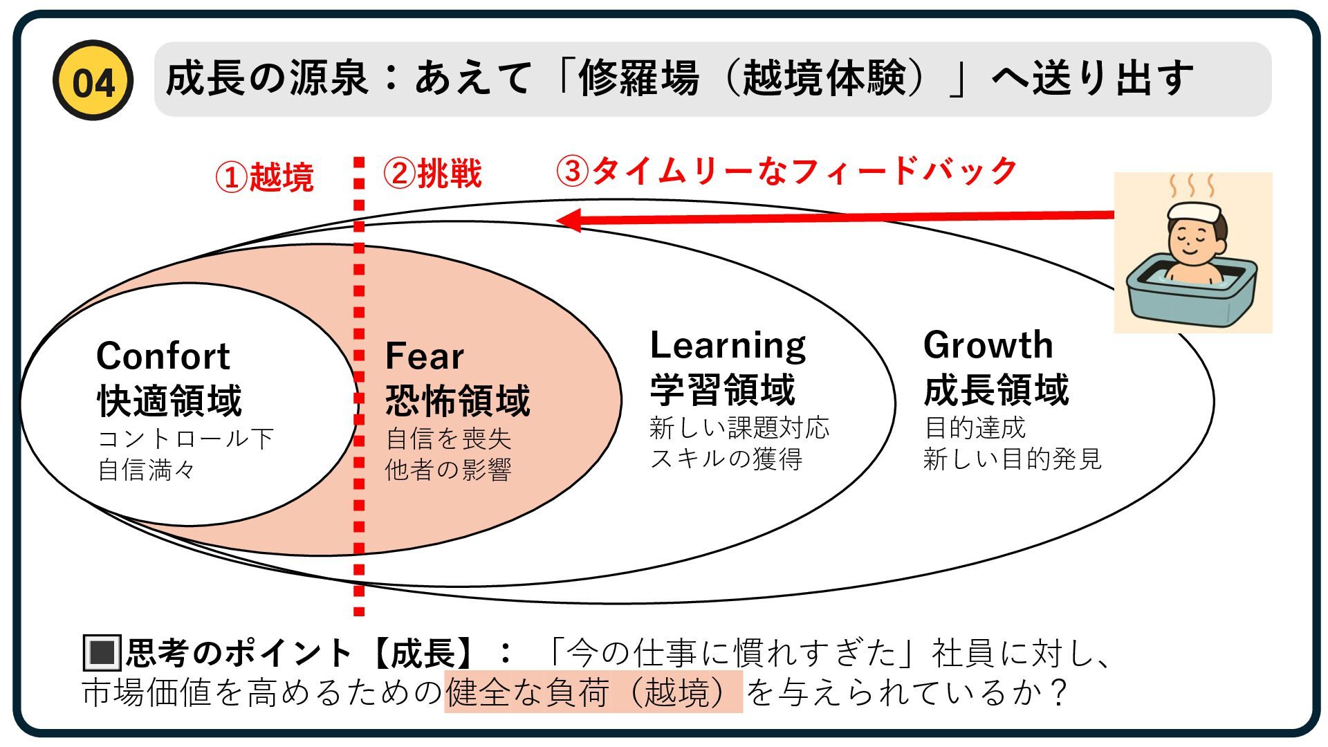 成長の源泉:あえて「修羅場(越境体験)」へ送り出す 04 思考のポイント【成長】: 「今の仕事に慣れすぎた」社員に対し、 市場価値を高めるための健全な負荷(越境)を与えられているか? Confort 快適領域 コントロール下 自信満々 Fear